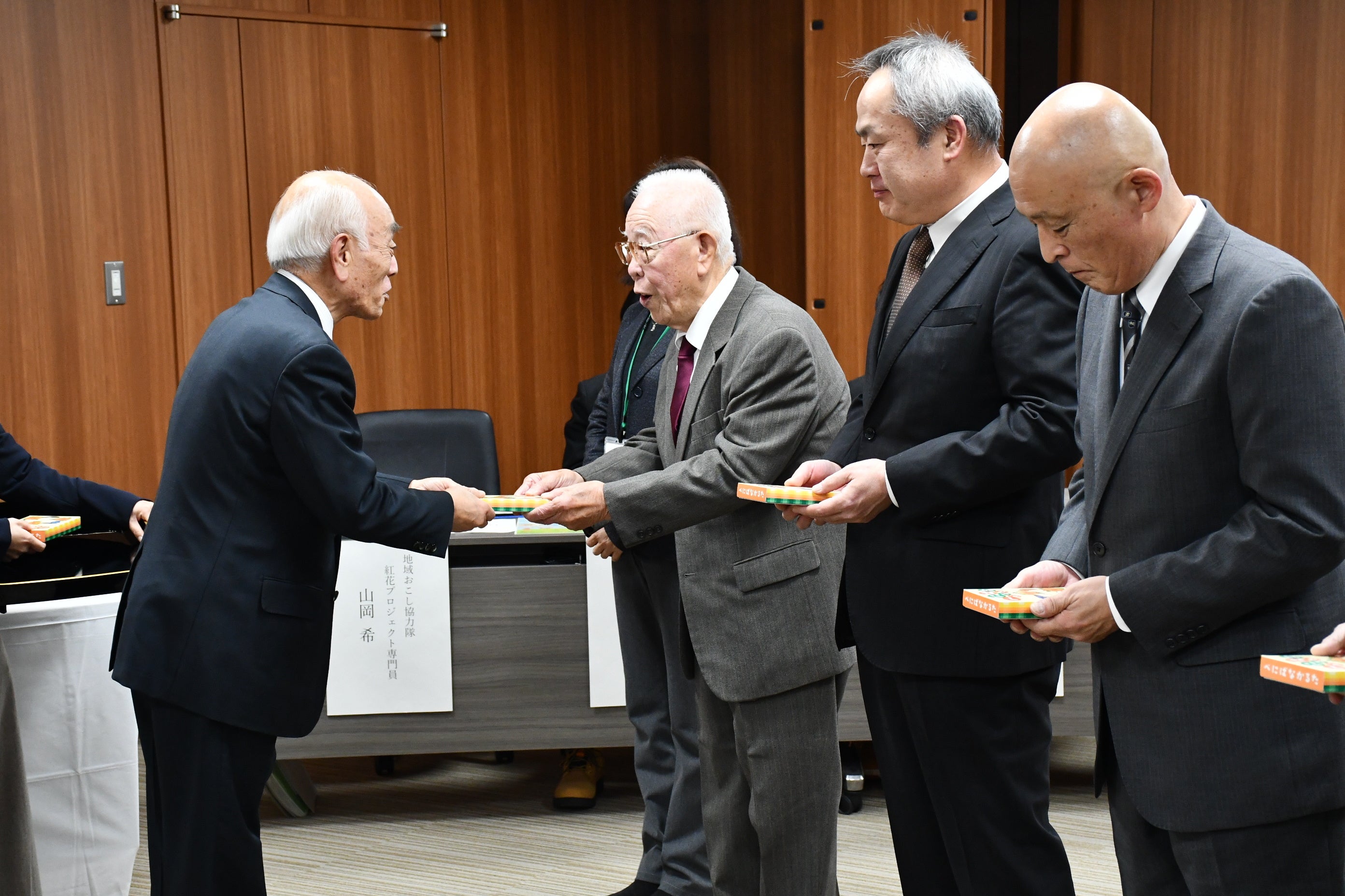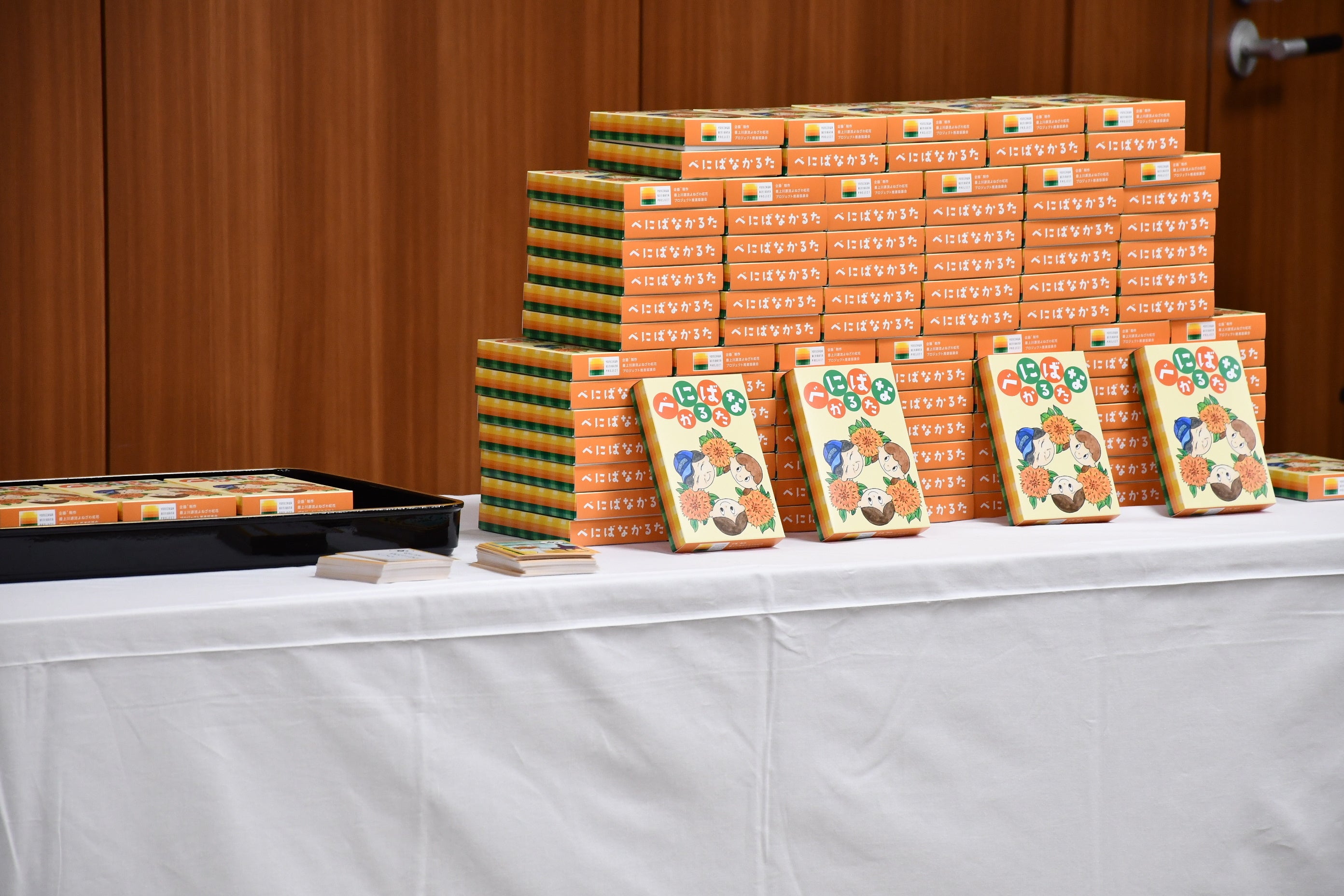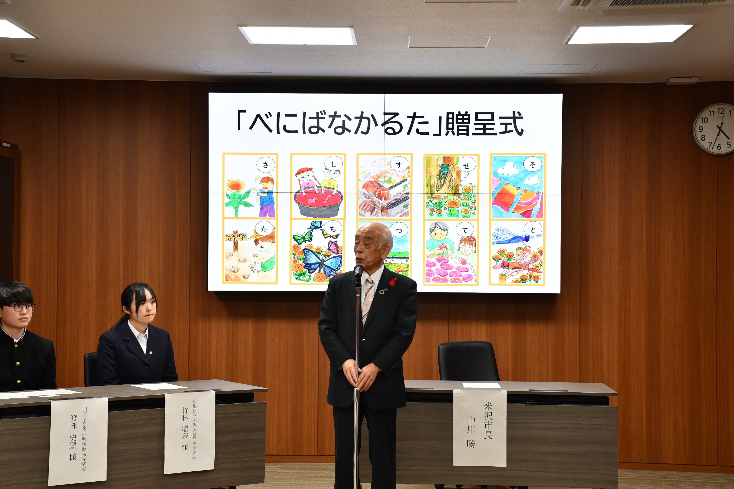山形の県花「紅花」をモチーフに、米沢市と高校生が制作した「べにばなかるた」を市内の各施設のみなさまに贈呈しました