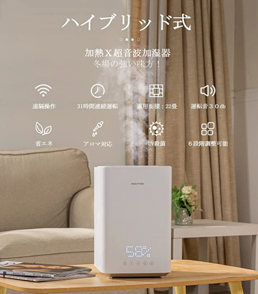 - 2022冬新登場 Pokitter 加湿器 ハイブリッド式 卓上 5L大容量 ハイパワー 超音波式×スチーム加熱式 温風 気化式 100℃高温×UV除菌 湿度表示 カビ防止