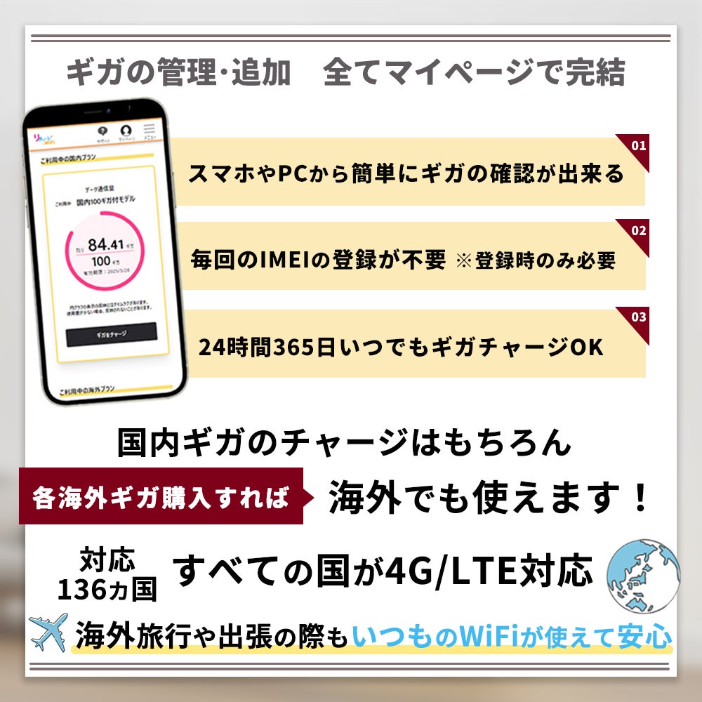 また、リチャージWiFiならPCやスマホからギガ容量を簡単に確認できるから、液晶無しでも安心!