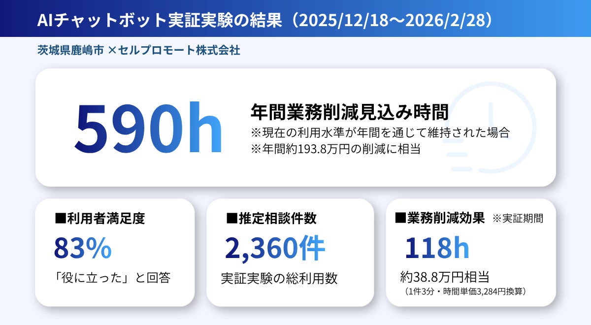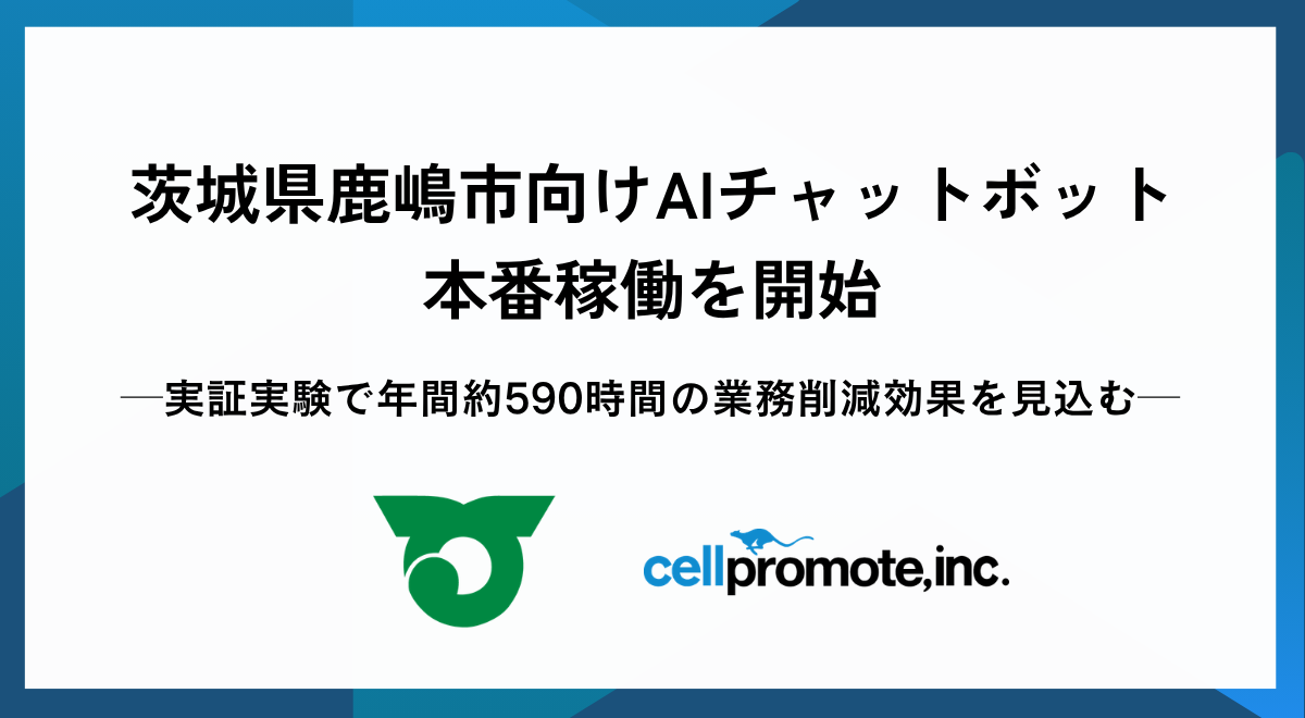 デジタルトランスフォーメーション(DX)支援を通じて企業の成長を促進するセルプロモート株式会社(代表取締役:林 亮太、本社所在地:東京都新宿区、以下「セルプロモート」)は、茨城県鹿嶋市(市長:田口 伸一、以下「鹿嶋市」)とのDX推進に関するパートナーシップに基づき、鹿嶋市向けに構築した「ホームページ学習型AIチャットボット」について、2026年4月1日より本番稼働を開始することをお知らせいたします。