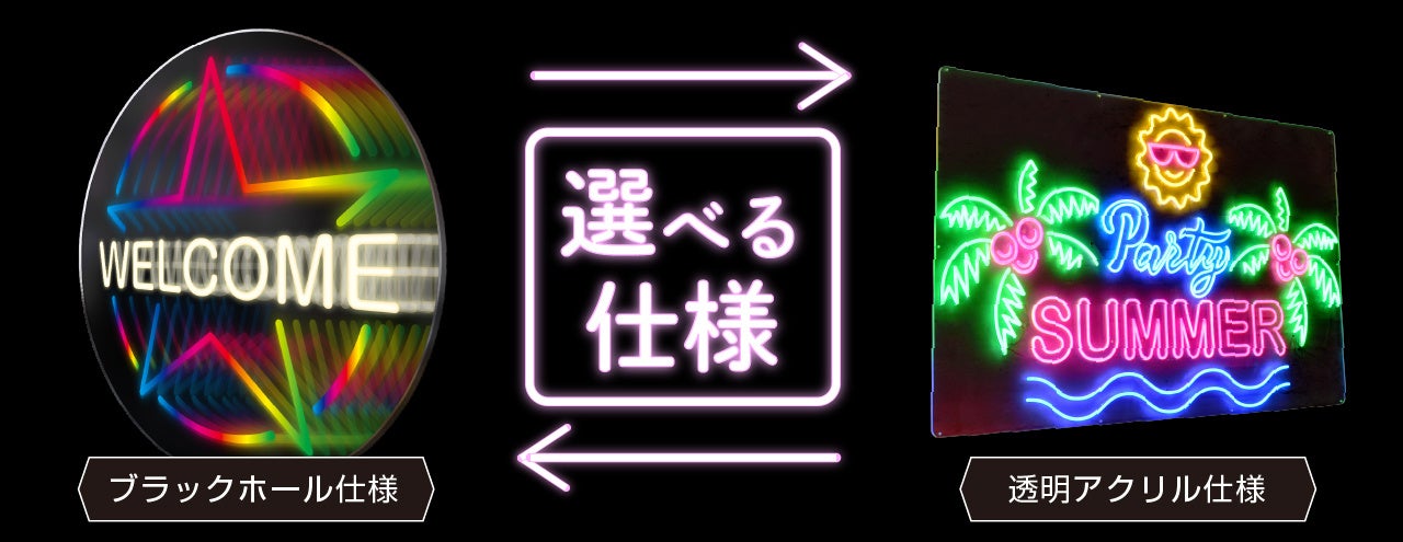 合わせ鏡の様にネオンを映し出す『ブラックホール仕様』、ネオンが宙に浮いているように映し出す『透明アクリル仕様』などデザインに応じて最適なものをご提案させて頂きます。