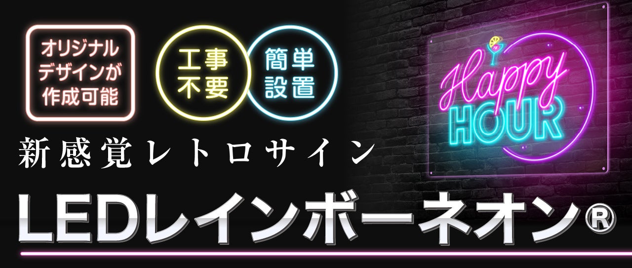 【LEDレインボーネオン】は省エネルギーなのに高輝度で発色し、工事不要で設置もカンタンな新感覚レトロサインです。ネオン管を表現したLED商材が多数ある中で、新たにリリースされた今回のLEDレインボーネオン。