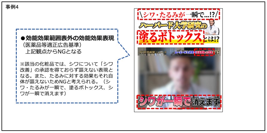 例5:【新規指摘内容】医薬部外品ではないシワに関する商材において、シワは完全になくなった、しわがピーン!、などのシワがなくなるかのような表現。