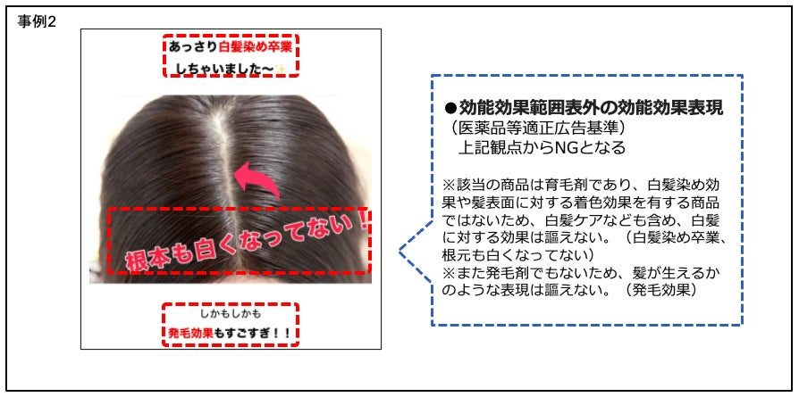 例6:【新規指摘内容】育毛剤において、塗る植毛、誰にもバレずに生やせる、などの表現や、BA画像により、あたかも髪が生えるかのような表現。また白髪が生えてこなくなる、白髪ケア、などの白髪に効果があるかのような表現。