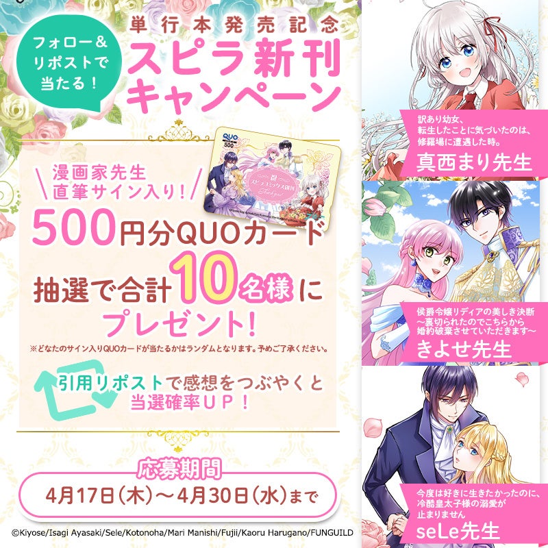 紙コミックスの発売を記念して、「漫画家先生の直筆サイン入り!スピラオリジナル印刷Quoカード」が当たる※1フォロー&リポストキャンペーンを実施いたします!