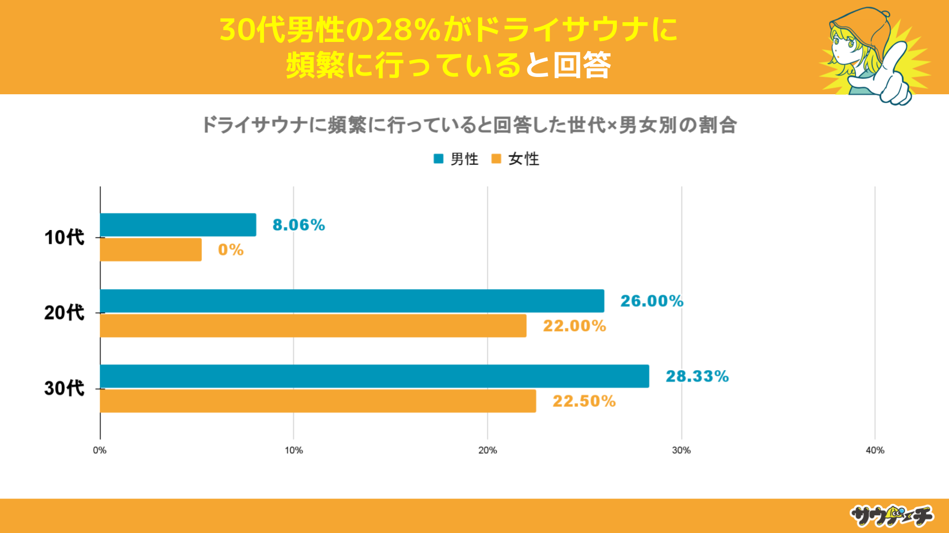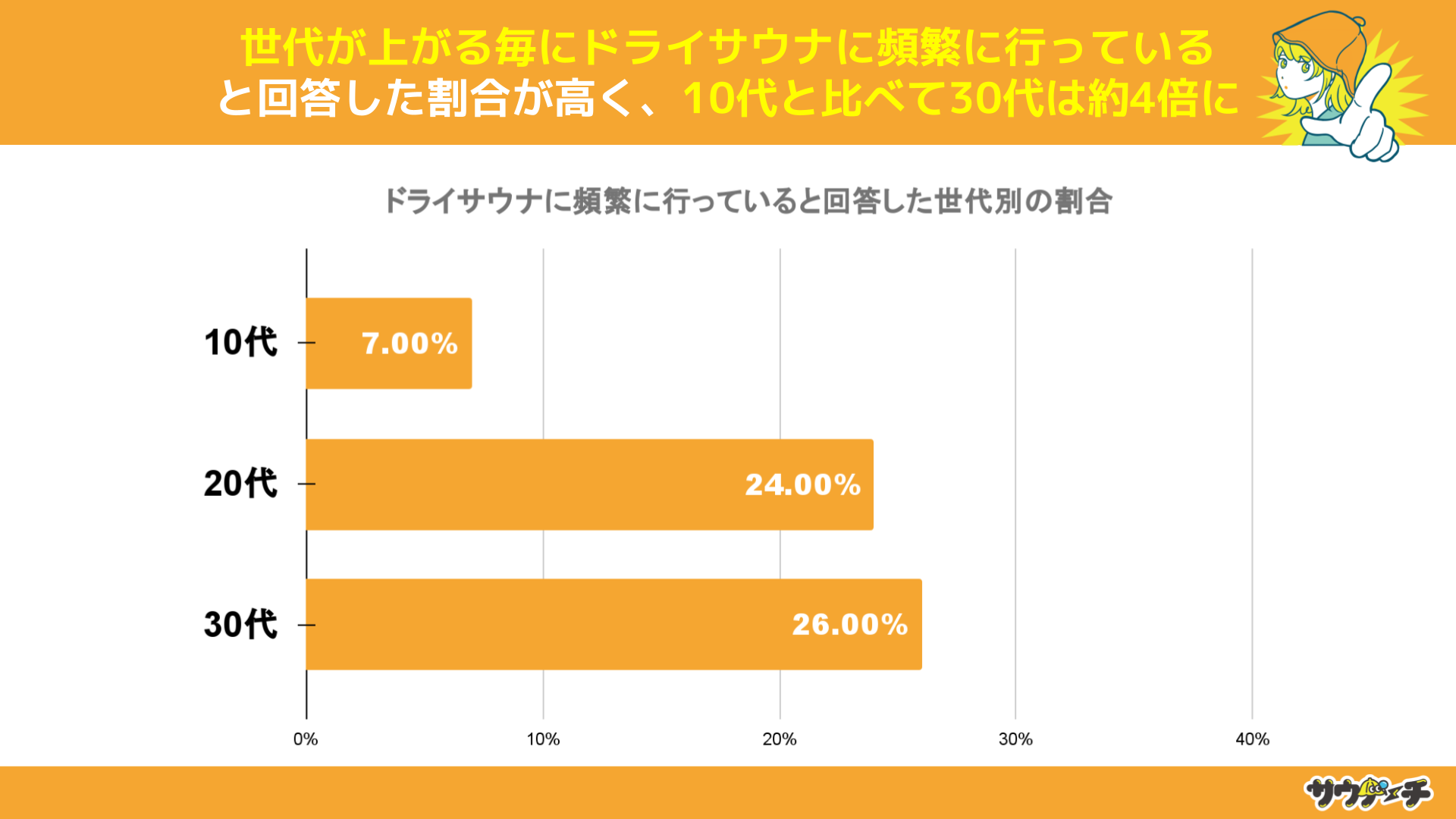 ドライサウナに頻繁に行っていると回答した割合を世代別でみてみますと、30代の26%が最も高く、次いで20代の24%、10代の7%と、世代が上がるほど割合が高くなり、10代と比べて30代は約4倍高い結果となりました。