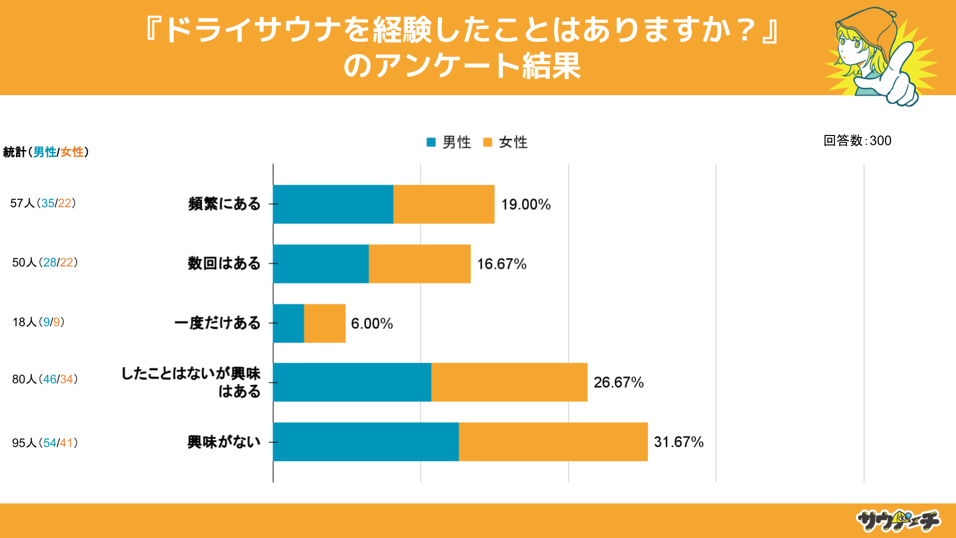 次いで多かったのが「したことはないが興味はある」と回答した方の26.67%、「頻繁にある」という回答が19%で、ドライサウナを経験したことがあると回答した方は全体の40%以上に及びました。