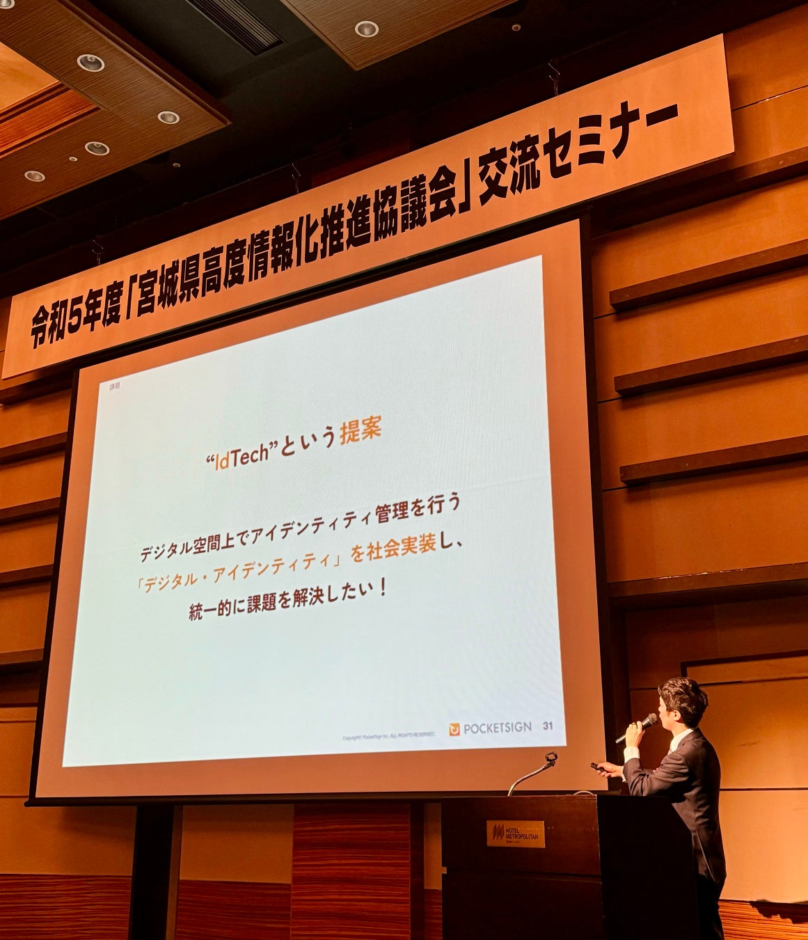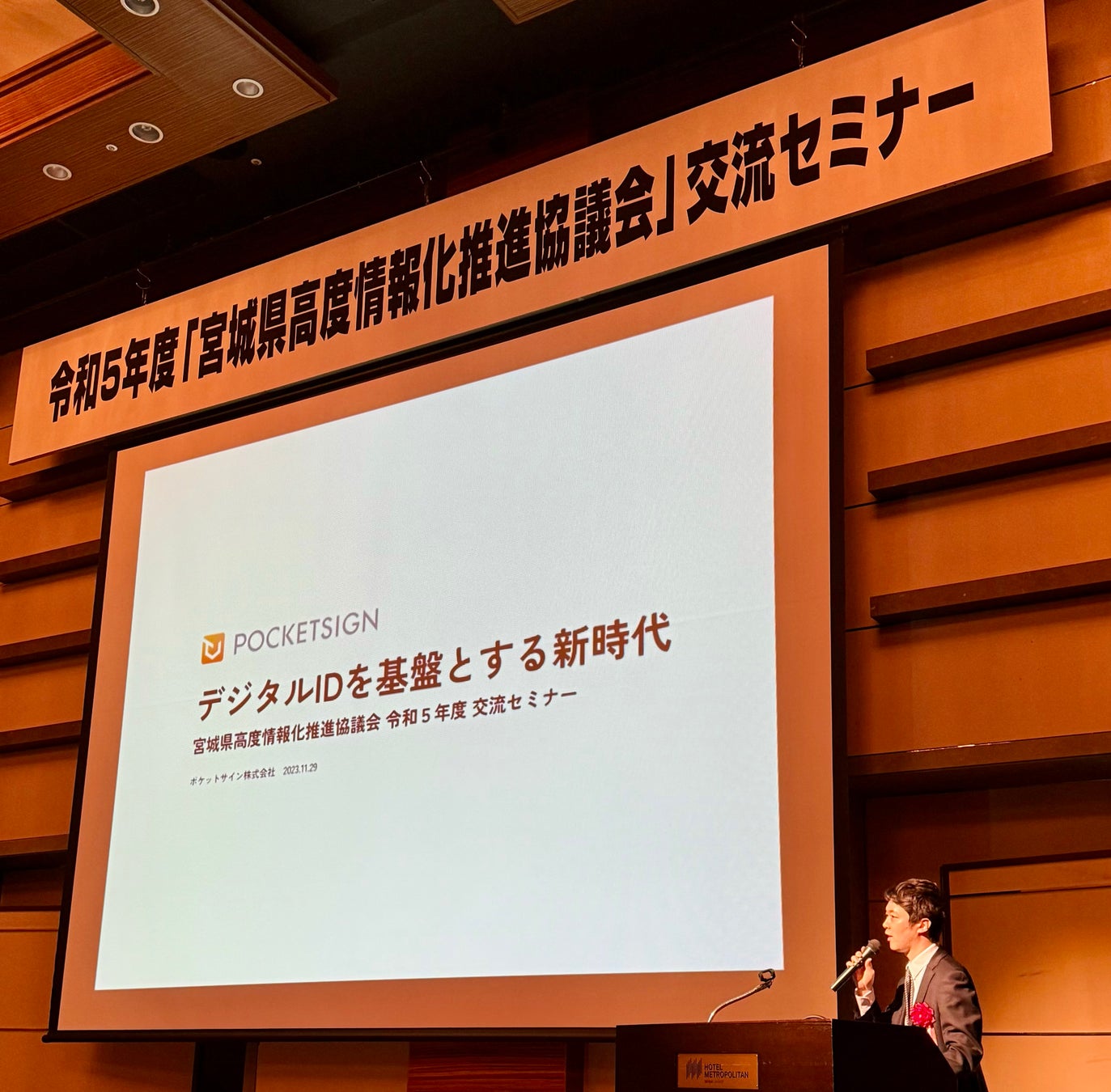 ホテルメトロポリタン仙台(宮城県・仙台市)にて行われた本セミナーにて、梅本は「デジタルIDを基盤とする”新時代”の実現」をテーマに講演。これからの時代における個人認証の在り方や、国内一普及した身分証であるマイナンバーカードを使用したデジタル身分証アプリ「ポケットサイン」、宮城県と共同で進めている行政サービスへの応用事例について紹介しました。