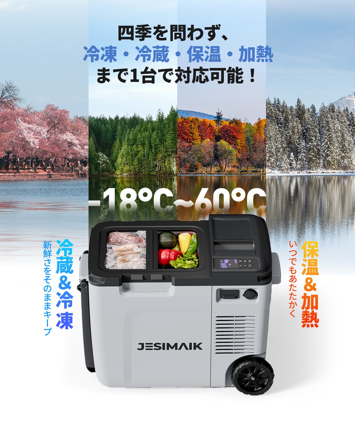 温度設定範囲は-18℃から60℃まで対応しており、さまざまなシーンに対応できます。夏のキャンプではキンキンに冷えた飲み物を楽しみ、冬には保温が必要な食材を入れて使用できます。
