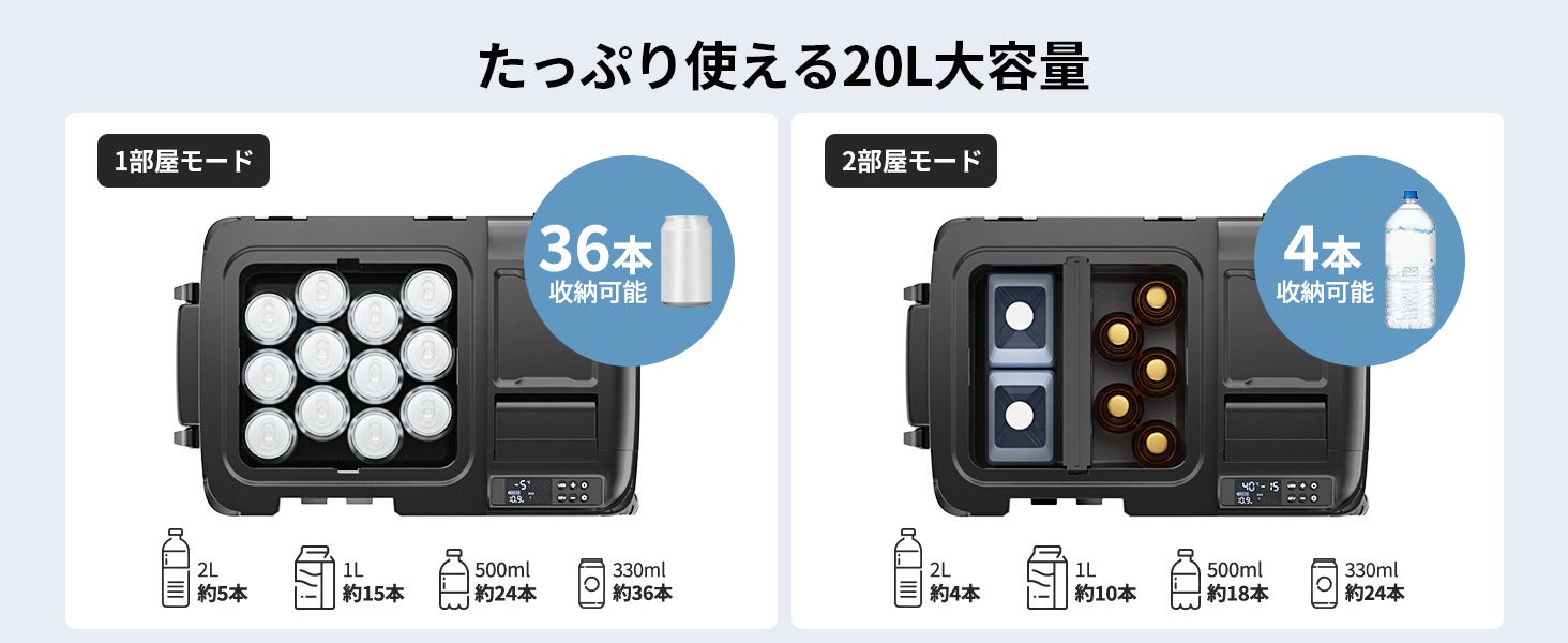 この冷蔵庫は、冷凍と保温の両方が可能で、使用者のニーズに合わせて内部スペースを自由に調整できます。さらに、先進的なフロンフリー技術を採用し、エネルギー効率を高め、環境にも優しく、冷却効果も抜群です。バッテリーと組み合わせて使用することで、長時間の使用が可能となり、キャンプやアウトドアに最適です!