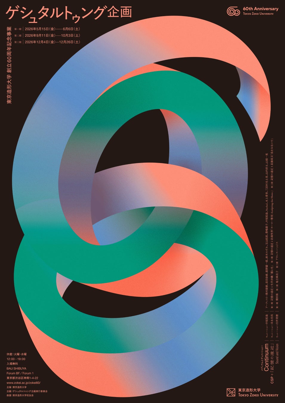 東京造形大学(所在地:東京都八王子市、学長:生嶋順理)は、創立60周年記念事業「ゲシュタルトゥング企画」を開催します。本企画は、2026年5月から12月にかけて、東京・渋谷のBAU SHIBUYAを会場に、3期にわたり展開されます。