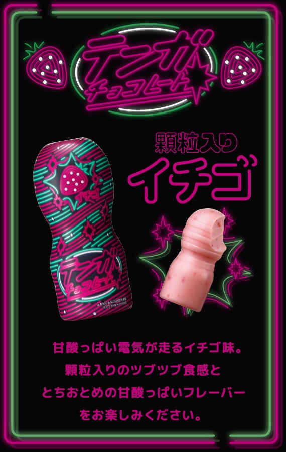 2017年から毎年バレンタインの時期に、パッケージもフレーバーも新たに発売している「TENGAチョコレート」。2024年は「イチゴ・バナナ・カカオ」の3つのフレーバーをネオンサインをイメージしたパッケージで販売しています。自動販売機での販売はココノススキノが初めてとなります。