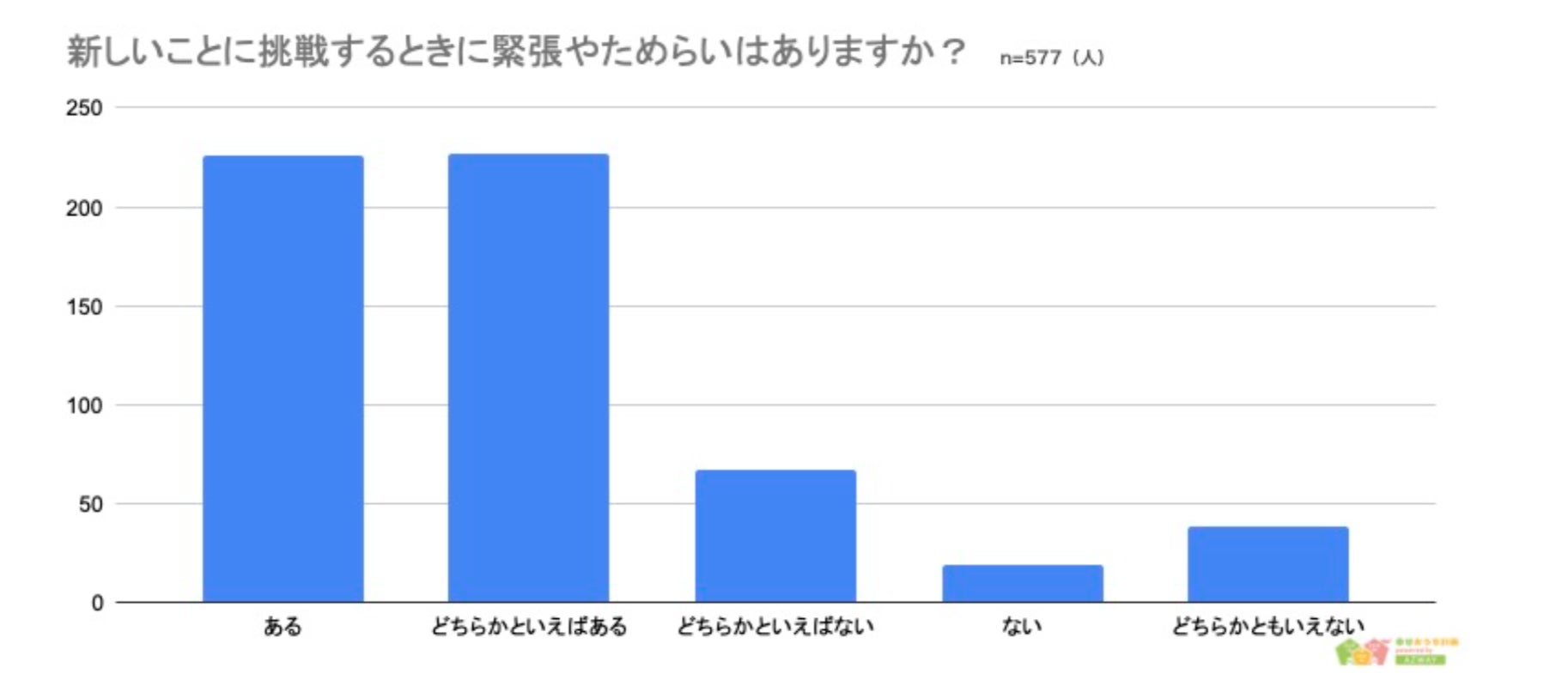 また、「新しいことに挑戦するときに緊張やためらいはありますか?」との質問には、「ある」と答えた人が226人、「どちらかといえばある」は227人という結果に。全体の約8割の人が、新たな挑戦に対し緊張やためらいを感じていることがわかりました。