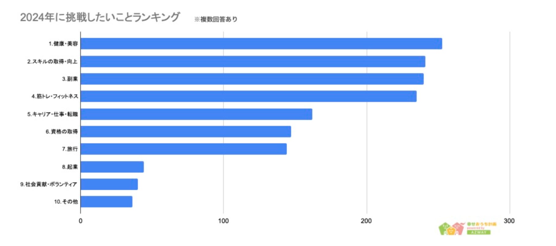 今回不動産メディア「幸せおうち計画」を運営する、株式会社AZWAY(本社:東京都豊島区、代表取締役:井口梓美)は、20代から60代以上までの男女577人を対象に「2024年に挑戦したいこと」についてアンケートを実施しました。