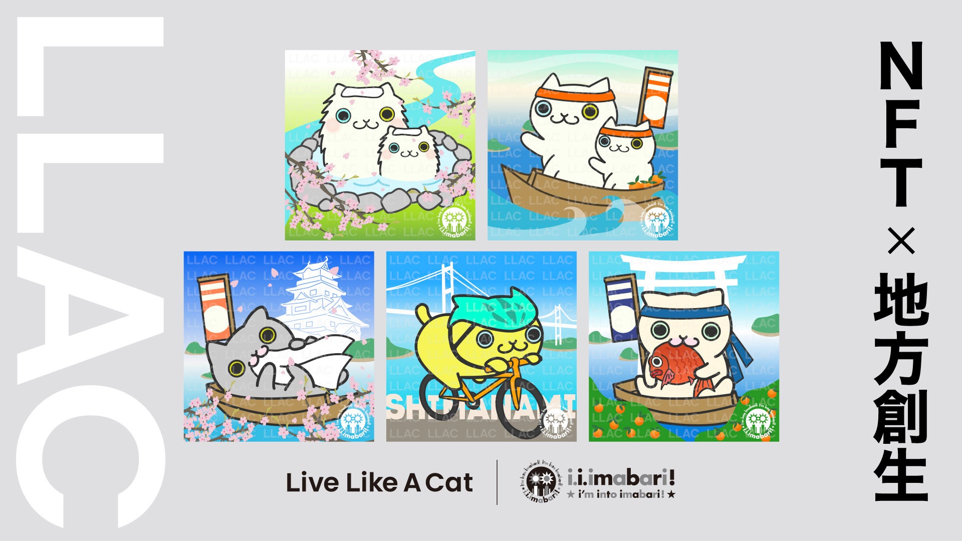 “猫のように生きる”がコンセプトのNFTプロジェクト『Live Like A Cat(以下、LLAC)』は、今治ブランド戦略会議と協業し、NFTを通じたデジタル関係人口創出を目指すプロジェクトを始動します。名所や特産品をデザインに織り込んだNFTを所有することで、今治市への興味を喚起し、関連アプリを通じて情報をNFT所有者に届けます。第1弾は2月に越谷レイクタウンで開催される愛媛県フェアで、デジタル来場記念として配布。第2弾は3月にオンライン上でのフリーミント(無料配布)を予定しています。NFTデザインはLLACのリードデザイナー・猫森うむ子氏の描き下ろし。DOSI NFTを活用することで、仮想通貨やウォレット不要の気軽なNFT体験を提供します。