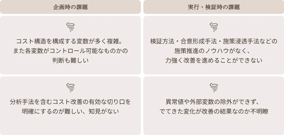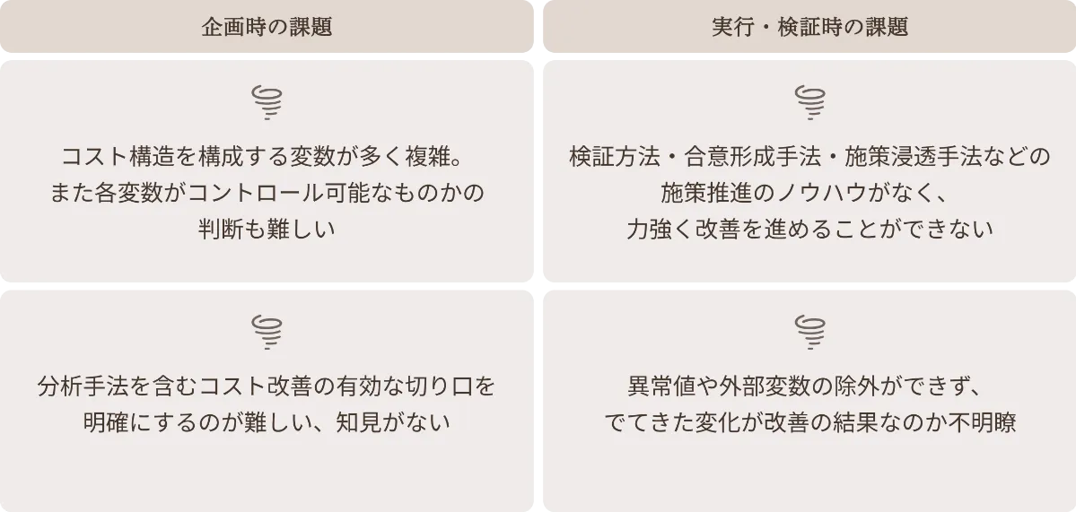 一方で、物流コストを構成する変数・要因が多岐にわたることから、物流コストの抜本的な改善には、企画・実行・検証のどの段階においても高い専門性が必要となり、継続的な施策として内製で進めていくことが難しい領域でした。