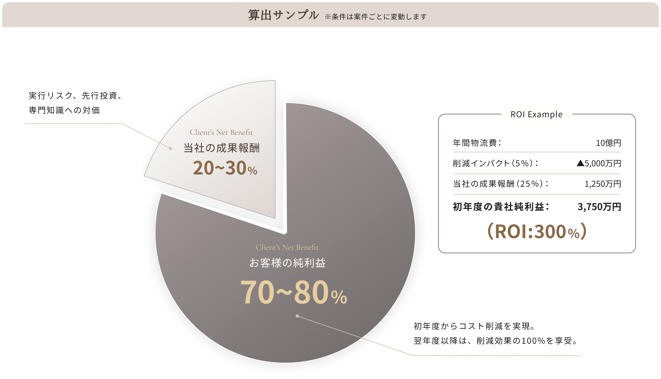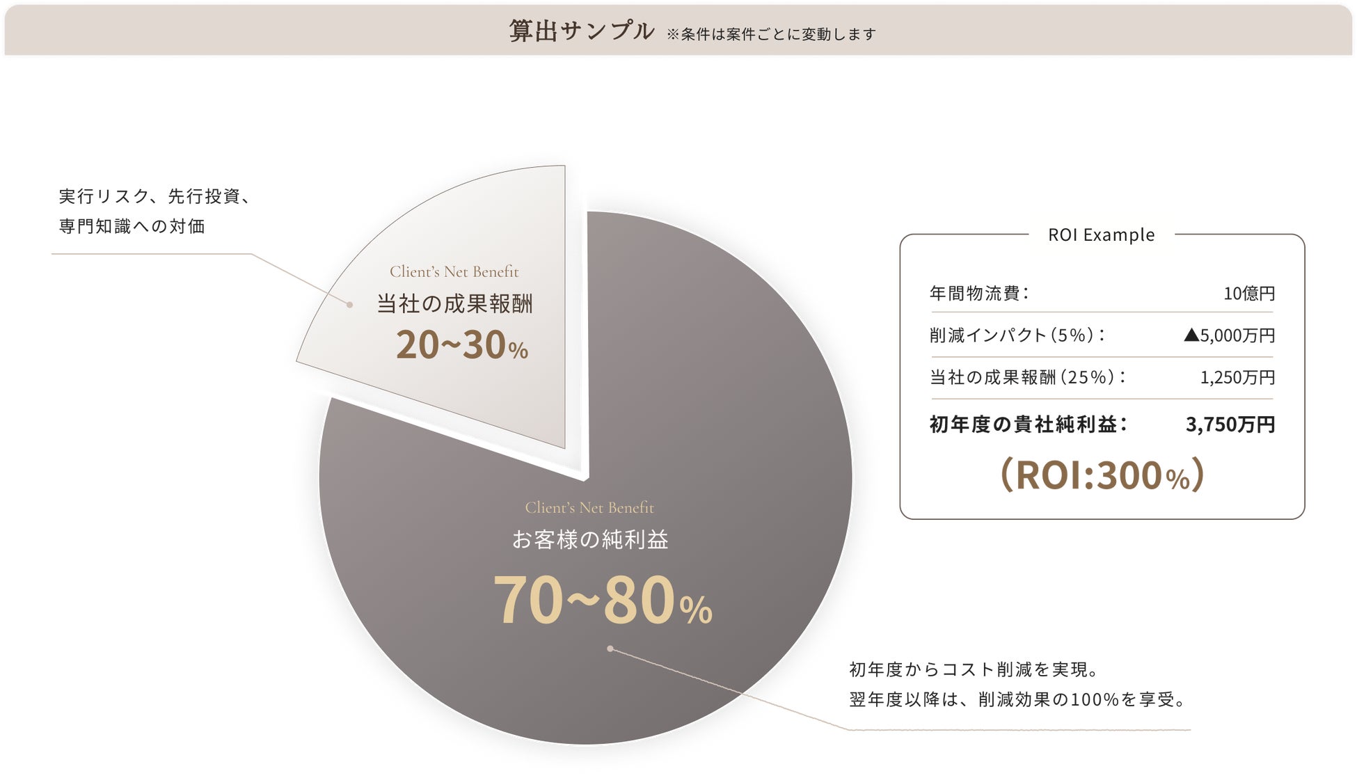 「成果が出た分だけ、費用をお支払いいただく」というゲインシェアリング型のビジネスモデルを採用し、実際に削減されたコストや向上した売上に対する成果報酬での共創・改善を約束いたします。