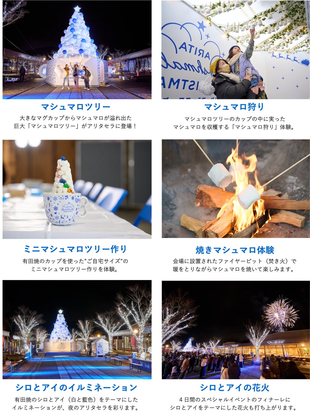 有田焼とマシュマロを楽しむ、アリタだけの特別なクリスマスイベント「アリタ・マシュマロ・クリスマス」は、1万球増加してより輝きを増した「シロとアイのイルミネーション」、当たり付きの「マシュマロ狩り」、昨年より打ち上げ数が増加した「シロとアイの花火」など、今年もよりたくさんの美味しいと楽しいを用意して、皆様のご来場をお待ちしています。
