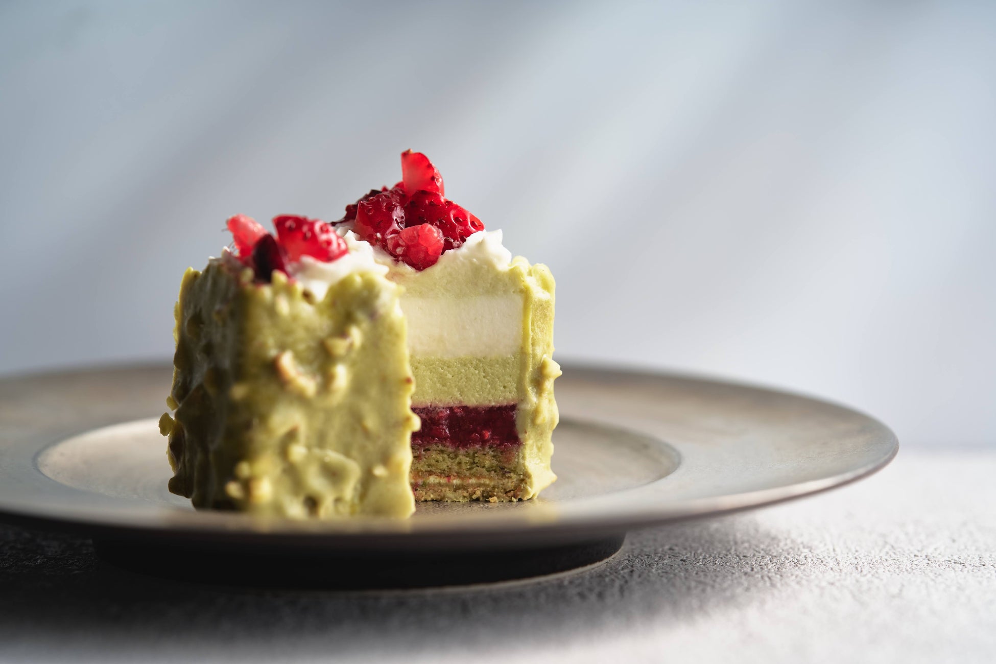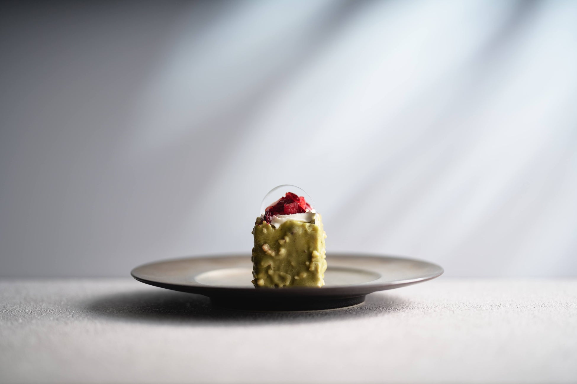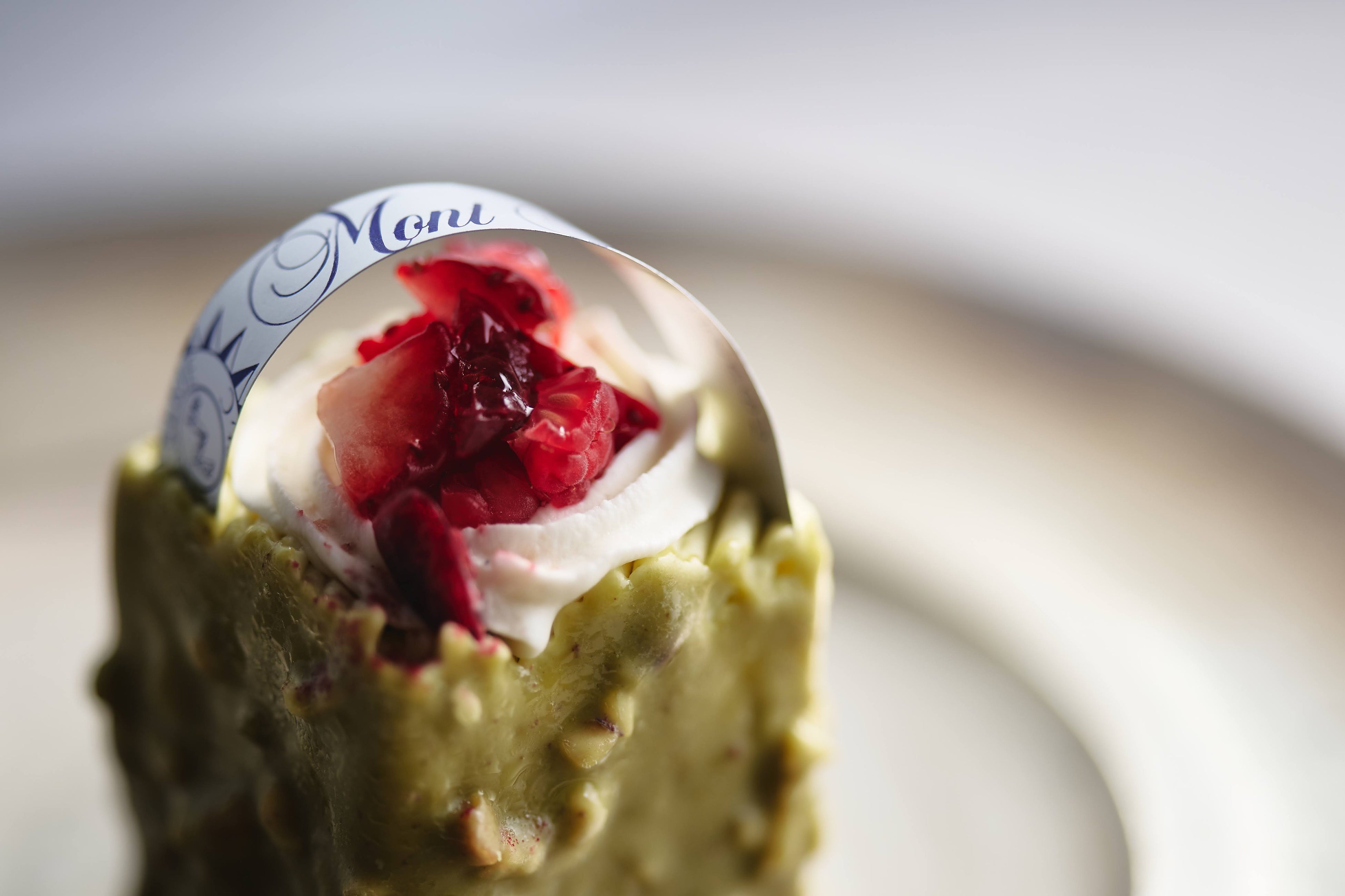 ライムの香りを加えたショコブランのムースにフランボワーズのジュレを合わせ、香り高く濃厚なピスタチオに爽やかさと軽やかさプラス。飾りに使った3種類のベリーが華やかさを演出。