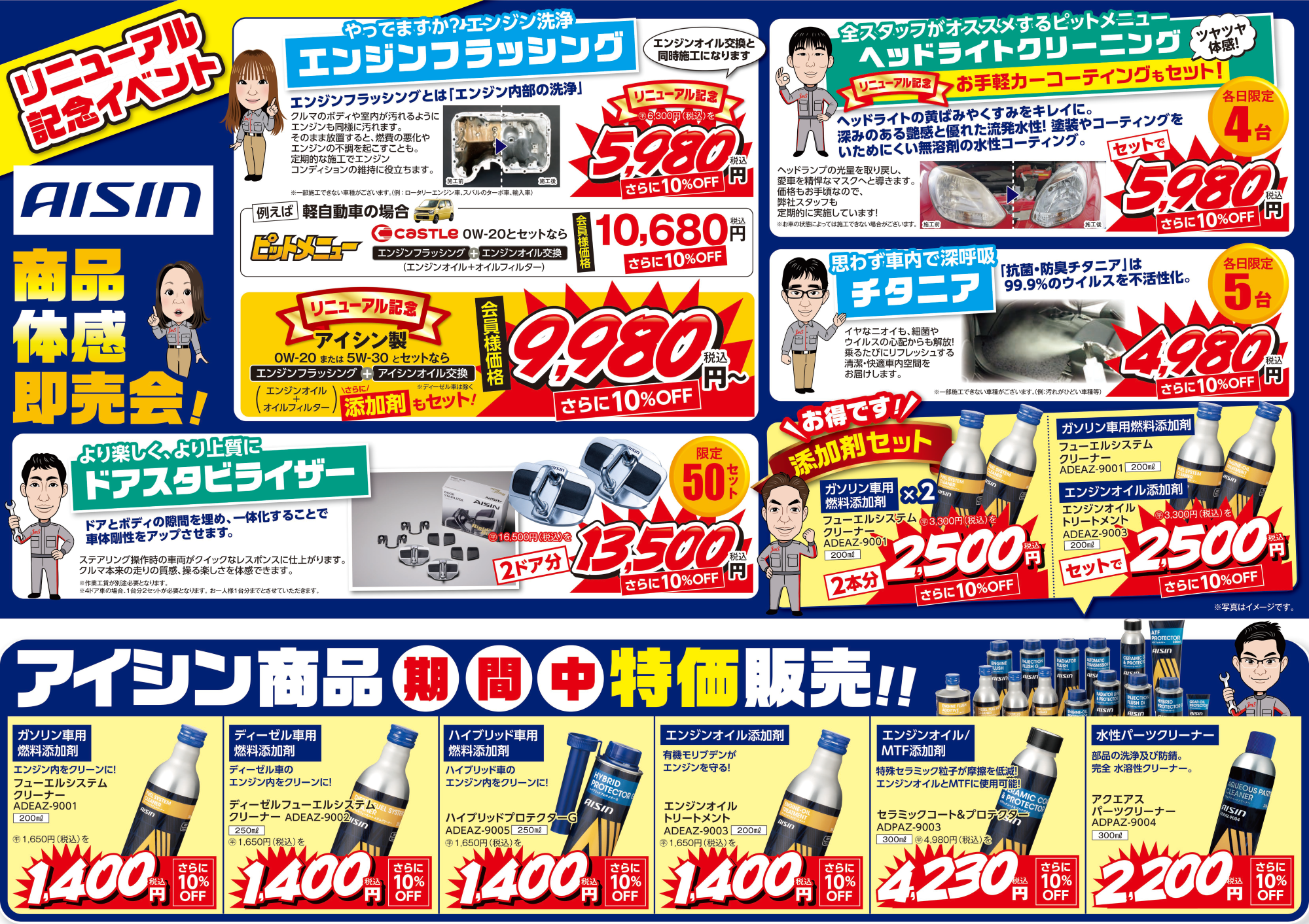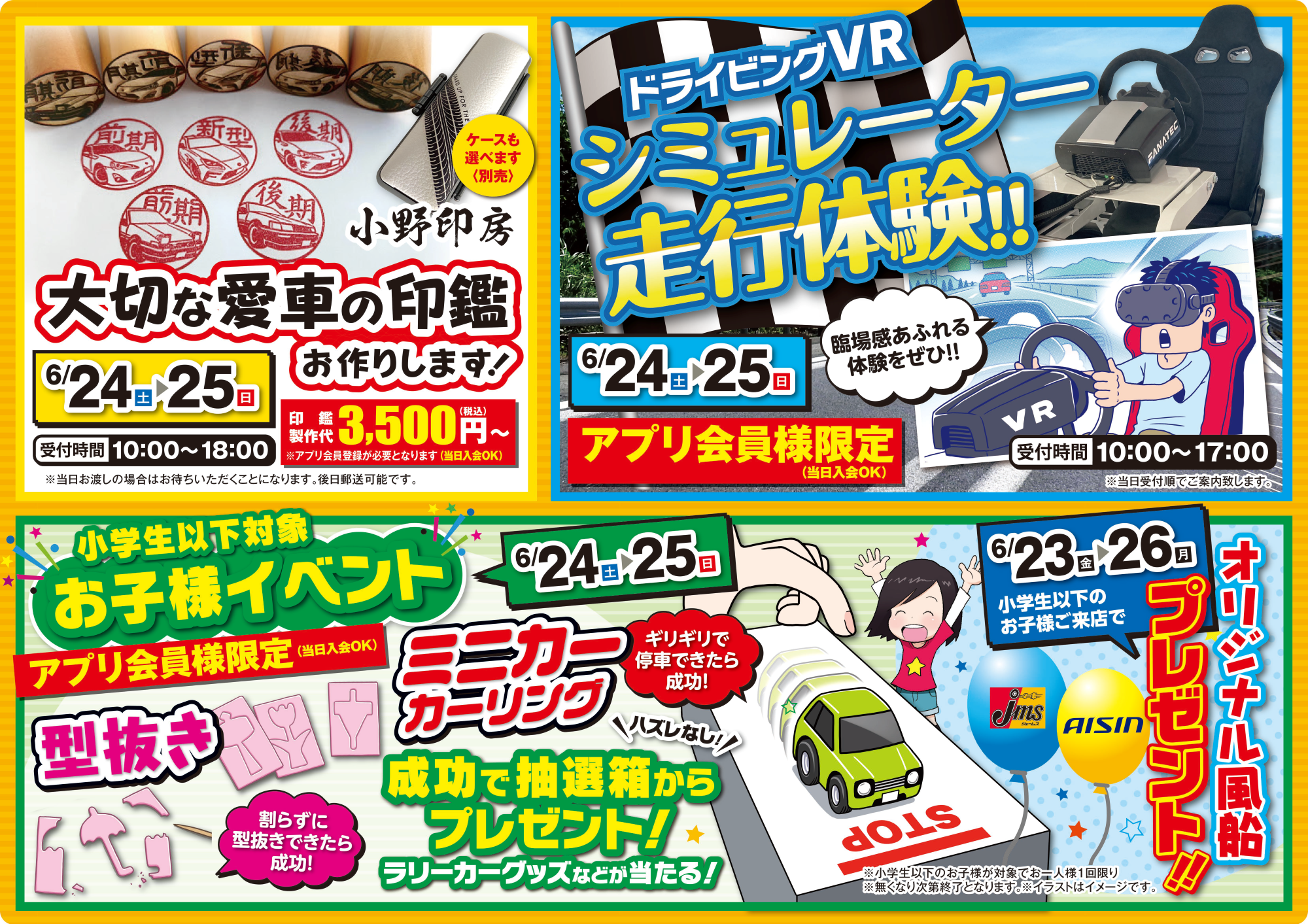 イベント期間中は、当社商品を特別価格で販売するとともに、店内全品店頭表示価格より10%オフ※3でお買い求めいただけます。また、車内抗菌・防臭のチタニア、カーコーティング付きのヘッドライトクリーニング、エンジンフラッシングなど、当社商品を使用したイベント限定のお得なピットメニューも用意※4しています。さらに、アプリ会員限定のお子様イベント※5やVRシュミレーター体験、5,000円(税込)以上のお買い上げで先着35名にアイシンのロゴ入りタンブラーをプレゼントなど、来店いただいた方にお楽しみいただける企画を盛りだくさん用意しています。