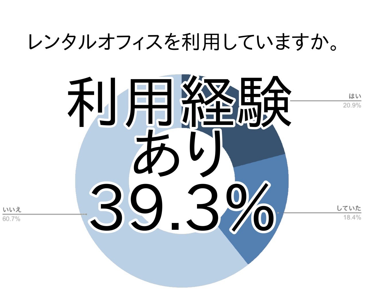 今回のアンケートの結果では全国におけるレンタルオフィス利用率は39.3%(はい20.9%・していた18.4%の合計)で、約4割の方がレンタルオフィスを利用した経験があることが分かりました。半数弱の利用経験があるということで、私たちにとってレンタルオフィスが親しみのあるものだと言えるでしょう。