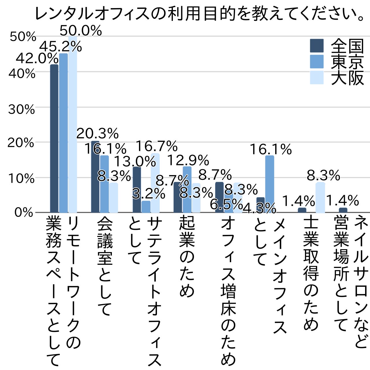アンケートでは次に、レンタルオフィスの利用目的を尋ねてみました。全国・東京・大阪を比較しながら見ていきましょう。