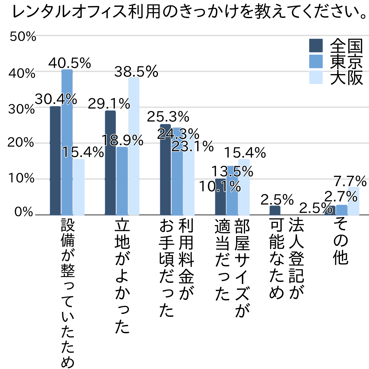 大阪では「立地がよかった」という意見が全国値に比べて20%程度多く、オフィスの立地条件を重視する傾向が顕著でした。