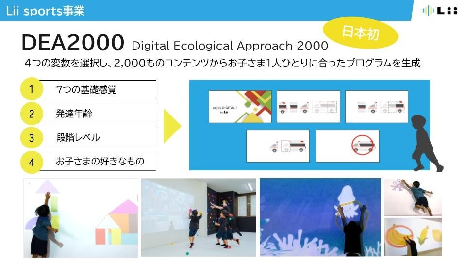 Lii sportsでは、独自開発した DEA2000(Digital Ecological Approach 2000) によって、2,000種類以上の運動プログラムを、7つの基礎感覚・発達年齢・段階レベル・子ども自身の「好き」 といった変数から自動生成。子どもたちが夢中になれる運動体験を提供しています。
