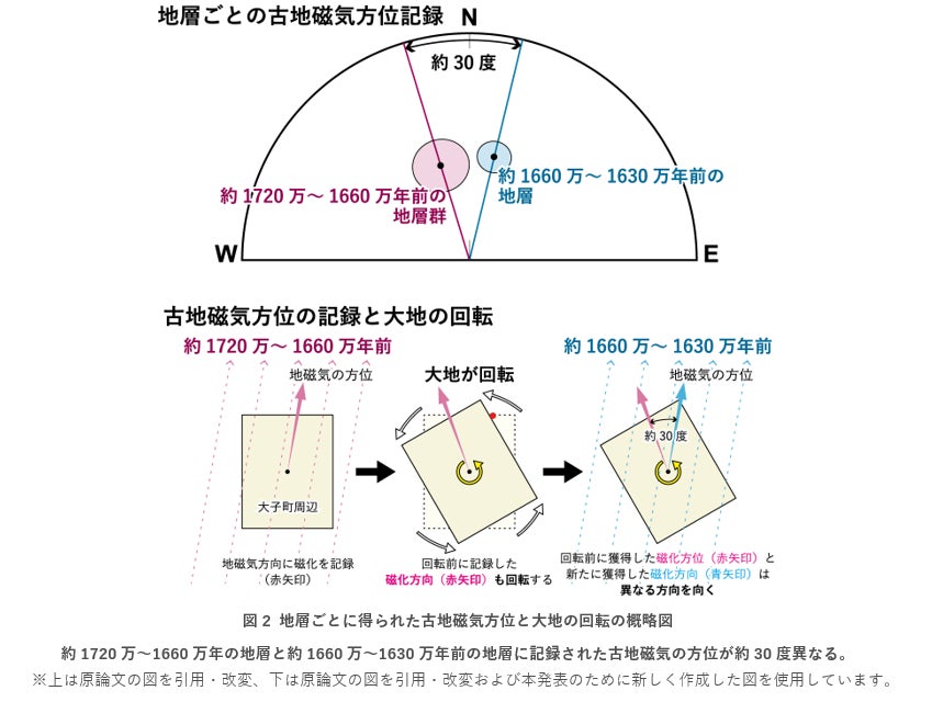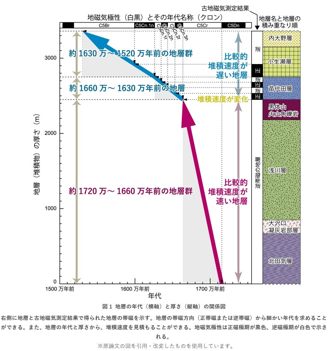 本研究は茨城県大子町周辺に分布する日本海拡大期の地層を調査し、日本海拡大時の古地磁気記録を探りました。その結果、正磁極期(現在の地磁気方位と同じで磁石が北を指す時代)と逆磁極期(現在の地磁気方位と逆、磁石の方位は南を指す時代)の地層があることを発見しました。それらの正・逆磁極期の年代から、約1720万~1660万年前の地層群、約1660万~1630万年前の地層、約1630万~1520万年前の地層群を認定できました(図1)。これは従来よりもはるかに精度よく地層の年代を解明できたことを意味します。