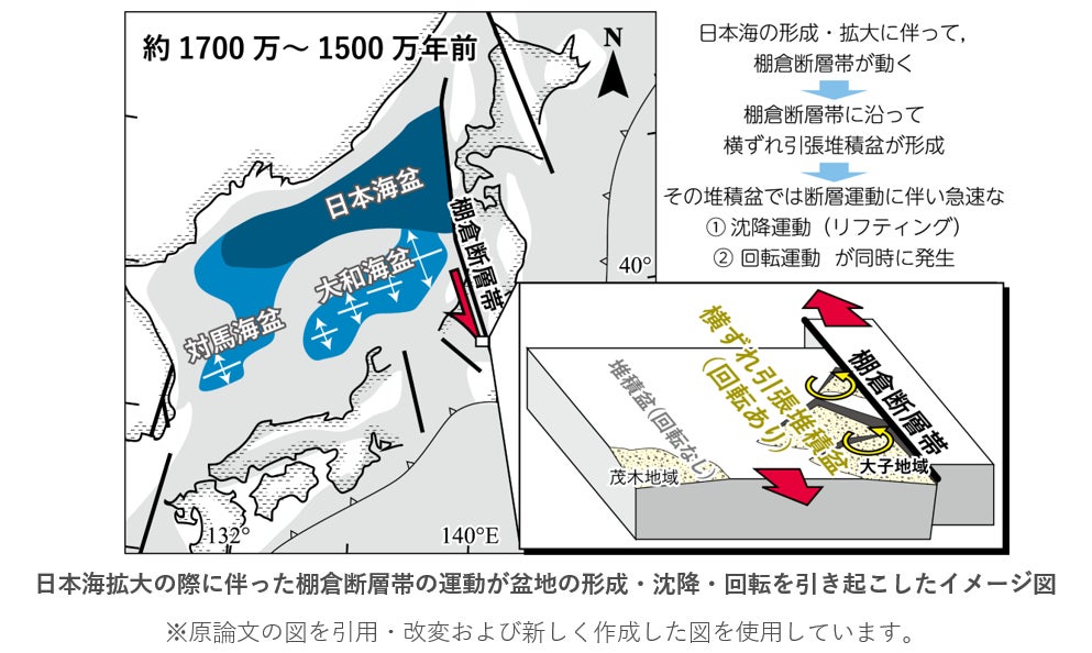 以上の成果によって、今から約1720万~1660万年前、棚倉断層帯の横ずれ運動によって堆積盆は急速に沈降すると共に回転も起こったことが判明しました。これは、日本列島を横断する大断層の運動が堆積盆の形成・沈降・回転を同時に引き起こしたことを初めて解明したものです。この研究によって、東北日本における日本海拡大時の回転運動の時期や規模、回転方向が不統一な原因が、断層運動による堆積盆の発達の時期や程度が異なるためである可能性が示されました。また、日本海拡大時には正断層の形成とその運動によって多くの堆積盆が形成・発達したと考えられていますが、本研究成果は正断層運動のみならず横ずれ断層の運動の影響も考慮すべきであることを示します。これは日本海の拡大のみならず、世界の他地域にもある背弧拡大のテクトニクスの理解に貢献します。