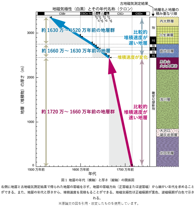 地層の年代を高精度に把握できたことにより、地層の年代と堆積物の厚さの関係から、堆積物が堆積盆を埋めた速度(堆積速度)を見積もることができました。その結果、特に約1720万~1660万年前の地層群は堆積速度が一段と速いことが分かりました(図1)。このことは、堆積盆の沈降速度が速かった可能性を示します。実際にこの時代に堆積盆内の環境は陸上から海へと変化しました(天野他、2011)。堆積盆の発達は棚倉断層帯の運動に左右されたと考えられるため、約1720万~1660万年前に、棚倉断層帯の運動によって急速に堆積盆は沈降したと考えられます。