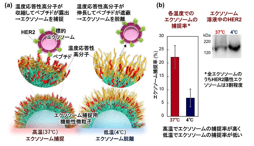 本研究では、温度変化に応答して性質を変化させる高分子と、エクソソームに対して特異的な親和力を有するペプチドをシリカ微粒子に修飾した機能性微粒子を作製しました。この機能性微粒子は温度37℃でエクソソームを捕捉することができ、さらに温度を4℃に下げることで、マイクロ粒子に捕捉していたエクソソームを脱離させ回収することができます。
