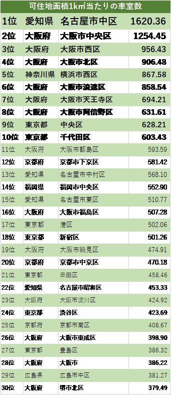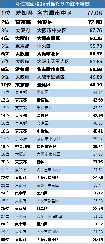 可住地面積1k㎡あたりの駐車場数が最も多かったのは「名古屋市中区」。次いで「台東区(東京都)」「大阪市中央区」と続きました。