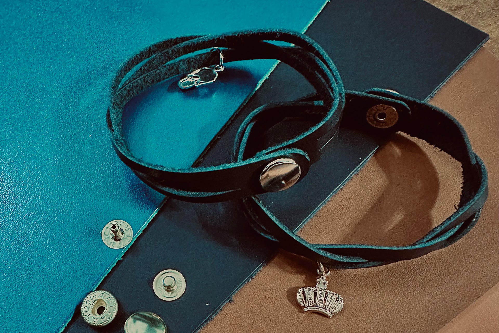 色や質感など気に入った革を選んだ後、ブレスレットに付けるアクセサリーを決め、自分の手首のサイズに合わせたオリジナルのブレスレットを完成させます。