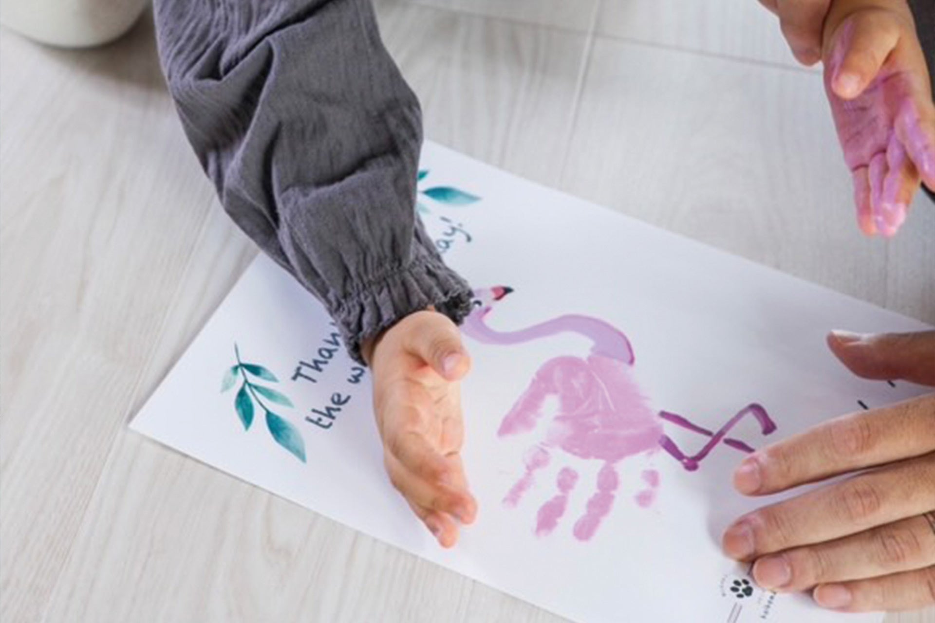 動物や景色など、半分描いてある絵に手のひらを押し付け、手形をスタンプとして押印。絵を完成させます。手のサイズに合わせた様々な絵を選ぶことができ、絵のテイストに合ったスタンプの色を選ぶことができます。