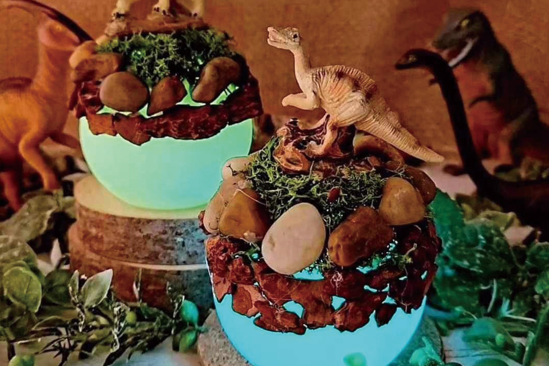 “恐竜がいる世界”をイメージしながら、石や木片を使ってライトボウルを飾り、恐竜を乗せます。恐竜の足元が何色も変わるので、持ち帰って暗い部屋で光らせると、次々と表情を変える、迫力満点の恐竜を楽しむことができます。
