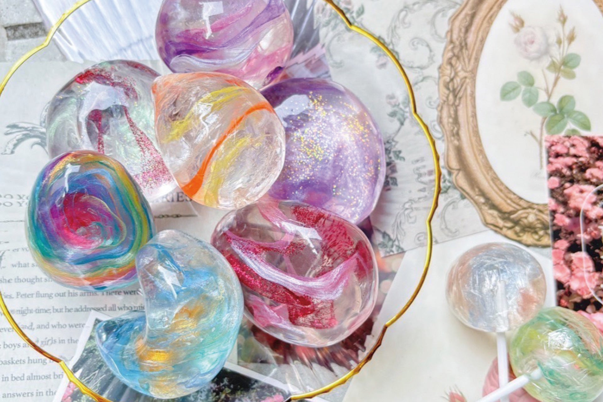 好きな色を選んで材料を混ぜ合わせた後、好みの形に成形し、クリアでキラキラしたオリジナルせっけんを作ることができます。