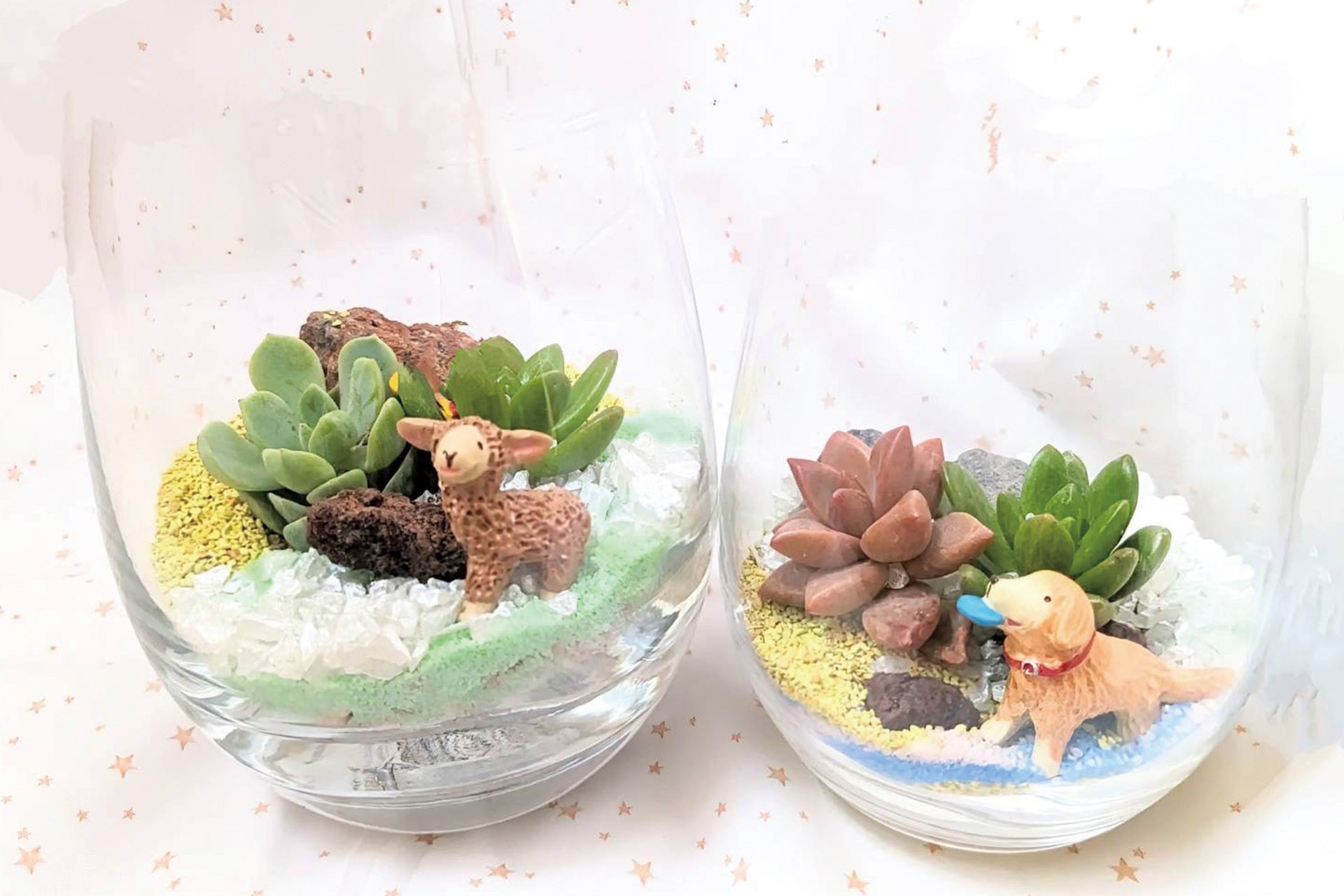 ガラスなどの透明な容器の中で生き物や植物を育てるテラリウム。密閉された容器の中で水分が循環するため、こまめに水の交換をせずに植物を育てることができます。多肉植物や砂、小物素材を組み合わせ、オリジナルのテラリウムを作ることができます。