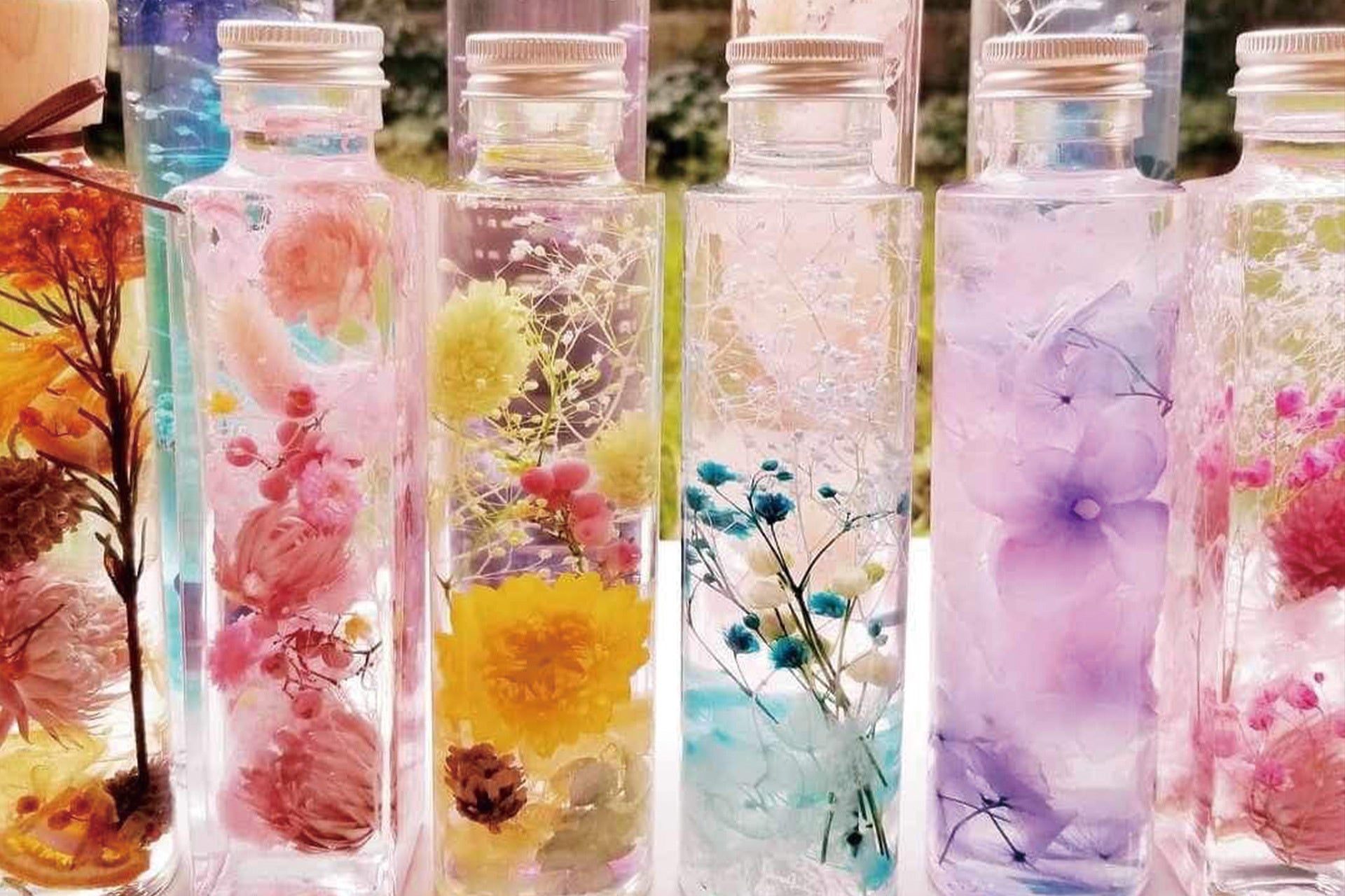 出来上がりをイメージしながらドライフラワーを選び、専用の容器に順番に組み入れ、オイルを流し込んでハーバリウムを製作します。生花ではなくドライフラワーを使うので、オイルの入れ替えなしで綺麗な状態で保存ができ、ご自宅のインテリアとして活用できます。