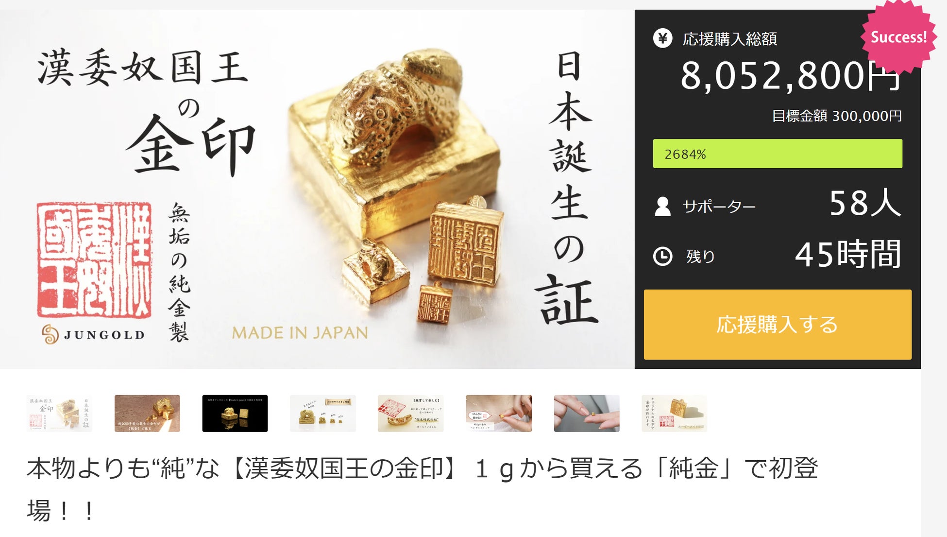 目標金額2684%達成!!。純金で作った「漢委奴国王の金印」プロジェクトのこり2日。応援購入サイトMakuakeにて。