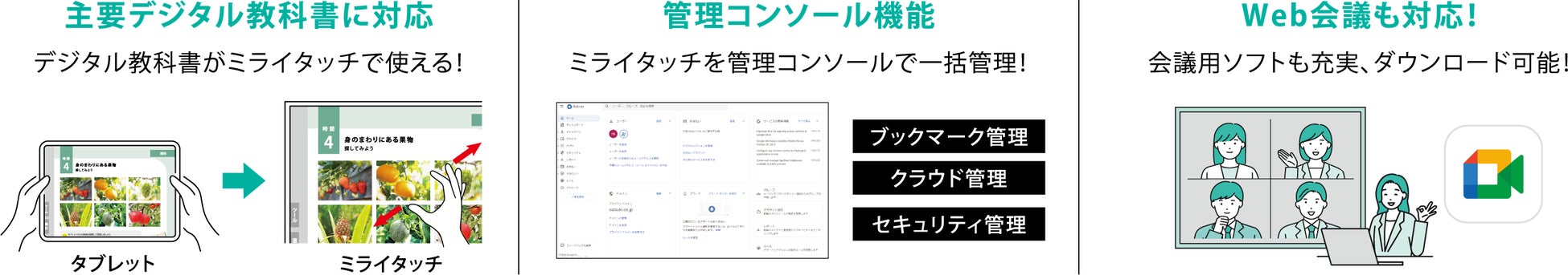主要デジタル教科書への対応や、管理コンソールでの一括管理、Web会議の利用など、授業をはじめ様々な場面で活用できる機能を搭載しています。