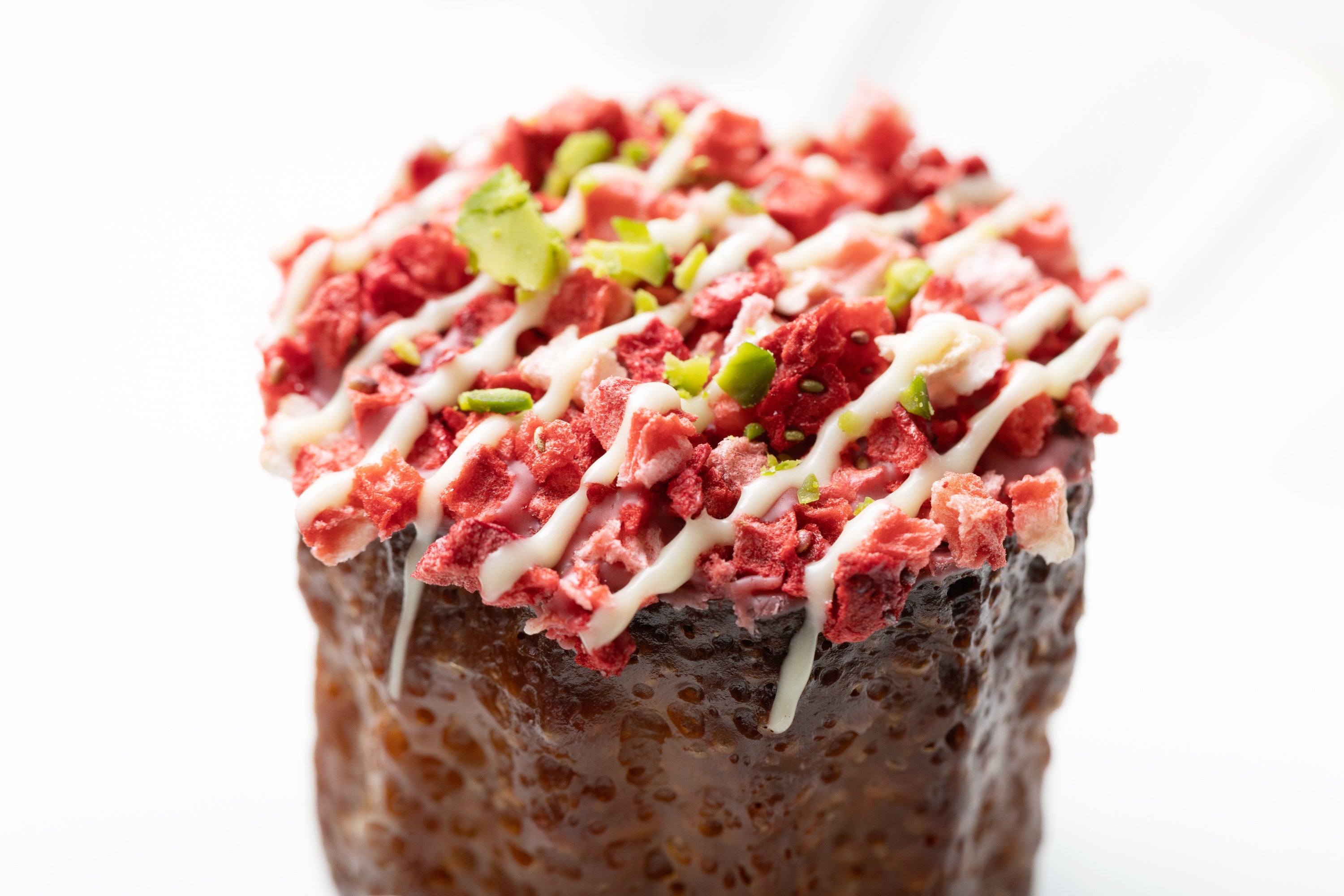 天面には、いちごチョコの上に、大量のドライいちごとピスタチオ。いちごの酸味をピスタチオのコクがまとめます。