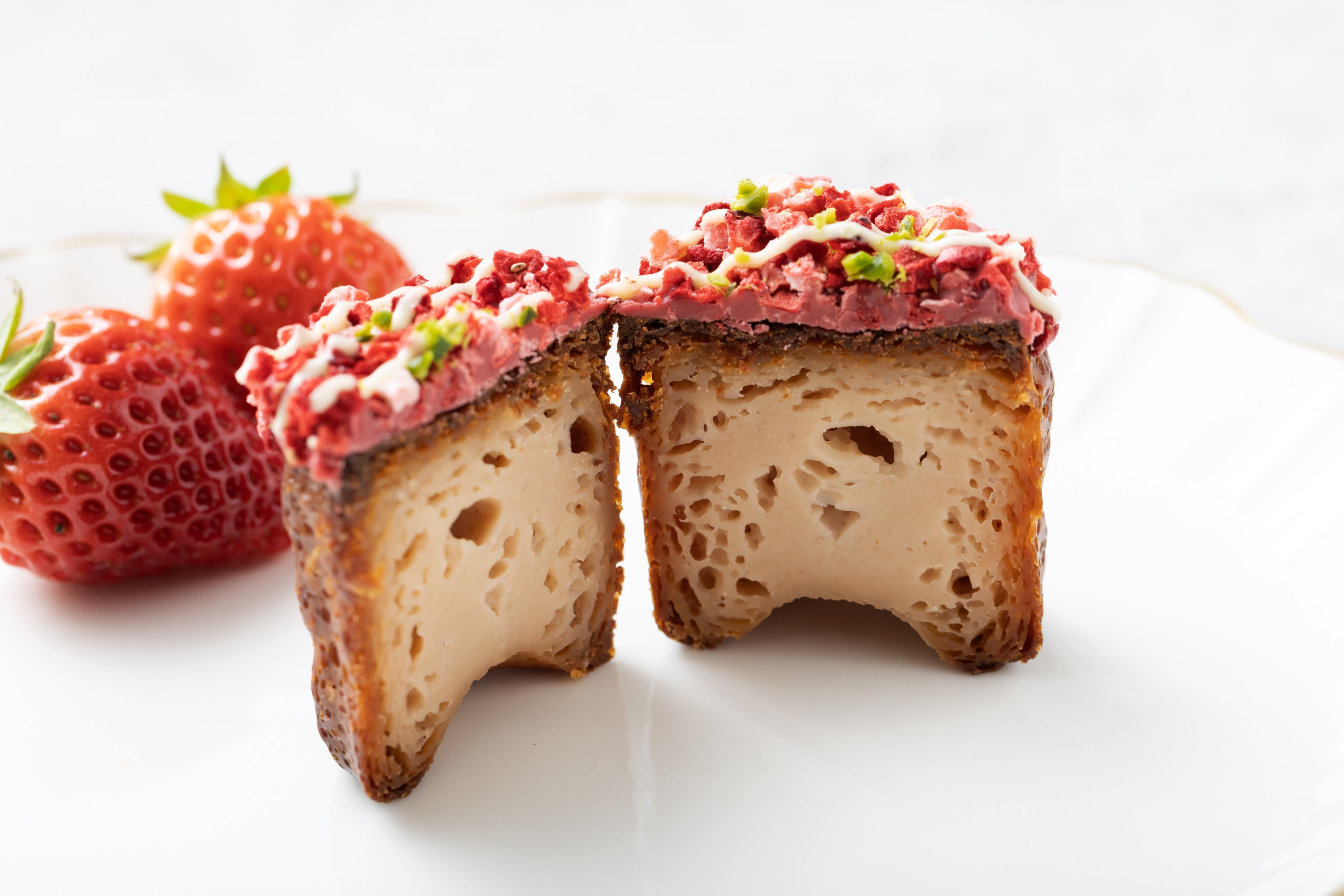 「いちごカヌレ」は、生地にもいちごチョコをたっぷりと使用。優しいいちごの甘みを感じられるカヌレに、デコレーションのいちごチョコレートの甘酢っぱさや、ドライいちごのアクセントある酸味がマッチングした逸品! ドライいちごの食感やいちごチョコの濃厚な甘味、いちご風味の生地の3層の味わいが春を演出し、口の中いっぱいにいちごおいしさが広がります。天面にあしらわれたピスタチオやピスタチオチョコの繊細なグラデーションも、春らしくかわいい仕上がりです。