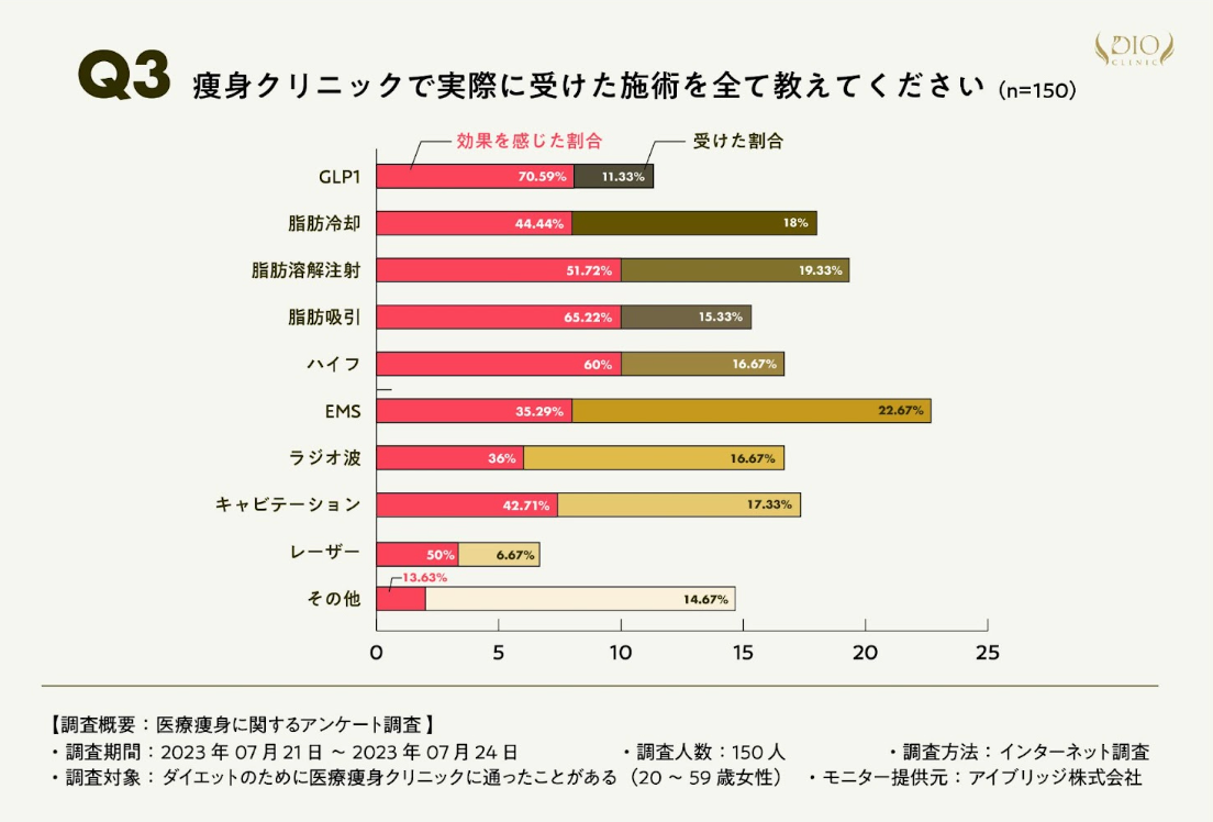 今回、実際に施術内容や効果等について詳しくご存知ない方へ、医療痩身サービスを専門に提供する「ディオクリニック」が、実際に痩身クリニックに通って医療ダイエットサービスを受けたことがある20〜50代女性150名を対象に実施した、医療ダイエットの口コミに関するアンケート調査結果を公開します。