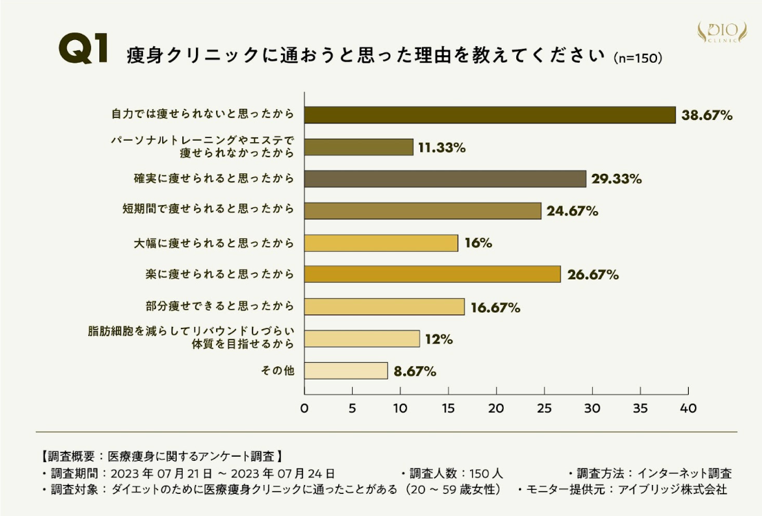 痩身クリニックに通おうと思った動機として最も多かったのは「自力では痩せられないと思ったから(38.67%)」というもの。「確実に痩せられると思ったから(29.33%)」「楽に痩せられると思ったから(26.67%)」という近しい動機も多く、医療ダイエットに対して、辛い思いをせずに確実に痩せられるという期待を寄せている人が多いことがわかります。