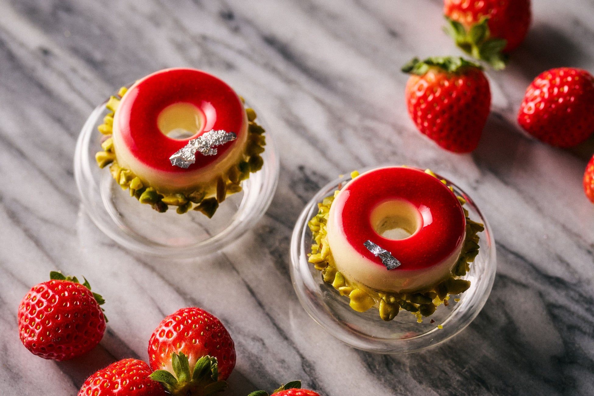 ピスタチオムースの上にいちごのソースをトッピングし、周囲をピスタチオで華やかにデコレーション。見た目も愛らしく、濃厚なピスタチオムースといちごの甘酸っぱさが絶妙に調和した一品です。