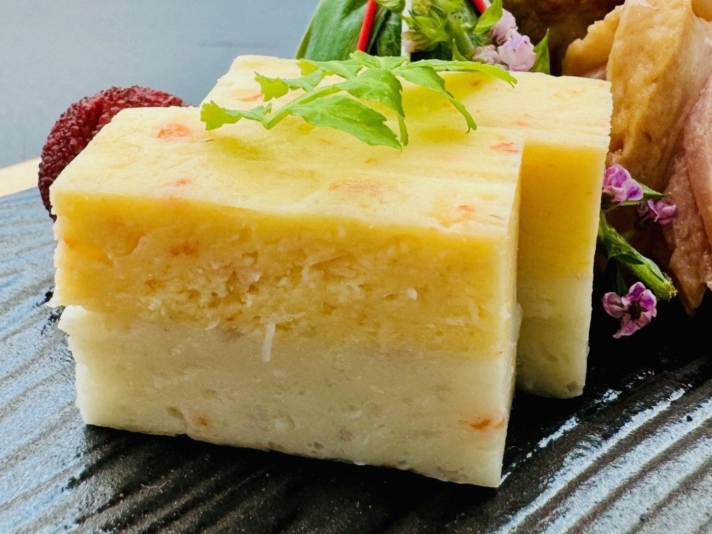 二層の美しさと味わいのバランス:上段にはカニの豊かな風味を閉じ込め、下段には野菜を加えたけんちん風の仕上がりで、見た目と味覚の両方を楽しむことができます。