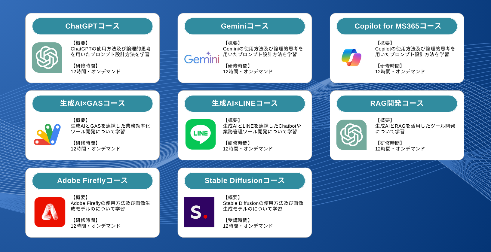 「ChatGPTコース」や「Copilot for MS365コース」、「Adobe Fireflyコース」など、全8コースの研修プログラムをeラーニング形式で提供し、企業のニーズや目的に合わせて生成AI研修を実施してまいります。