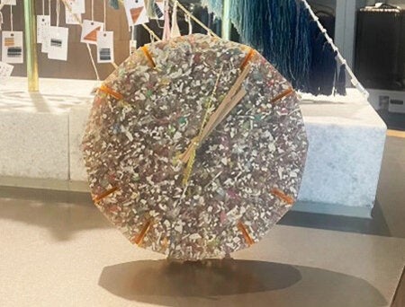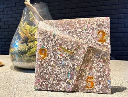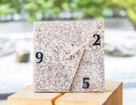 上記の廃プラスチックを集約後、REMAREのリサイクル技術により、粉砕・溶解・成形し、以下のような特徴的な時計が各施設のためにオーダーメイドで制作されました。