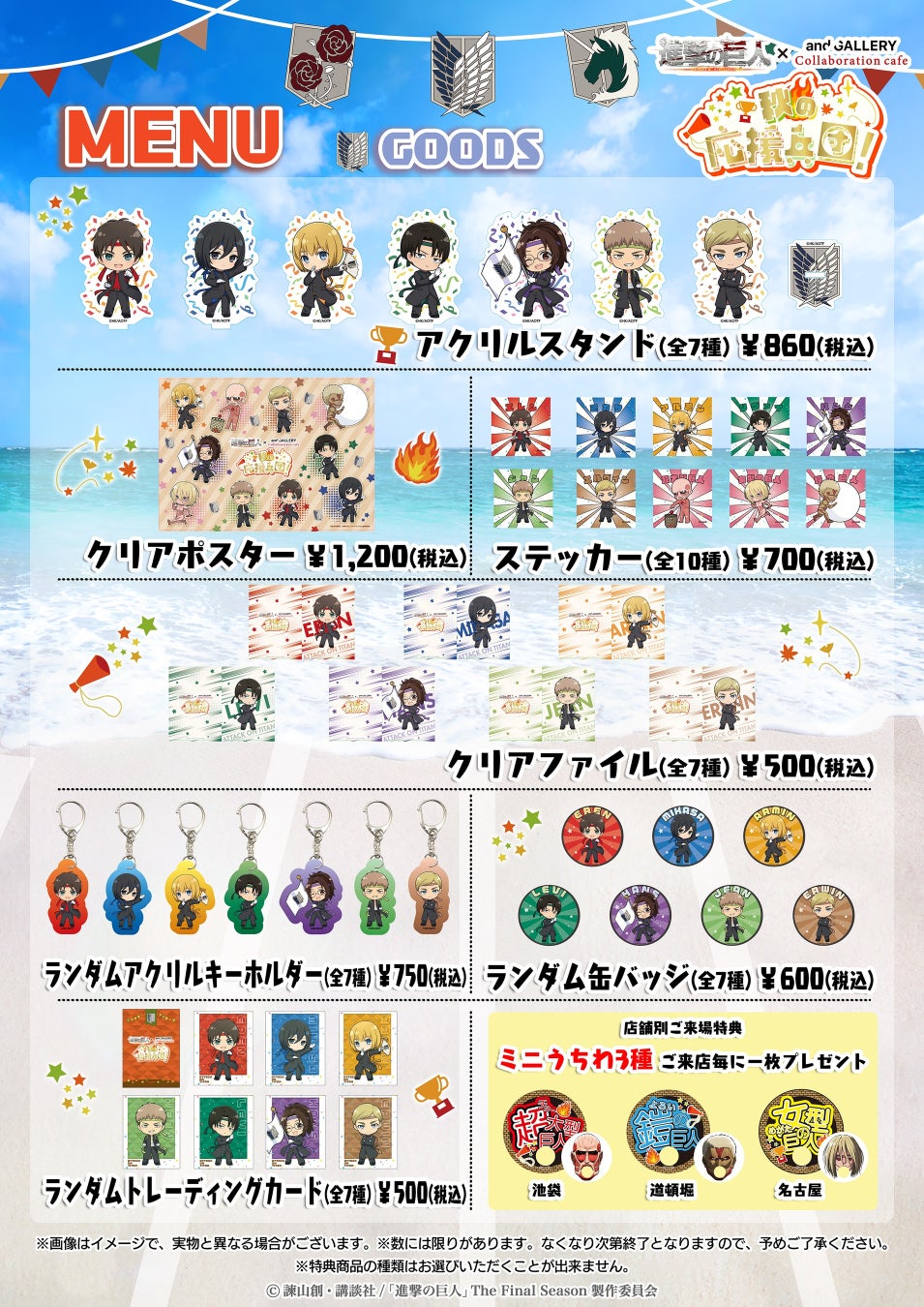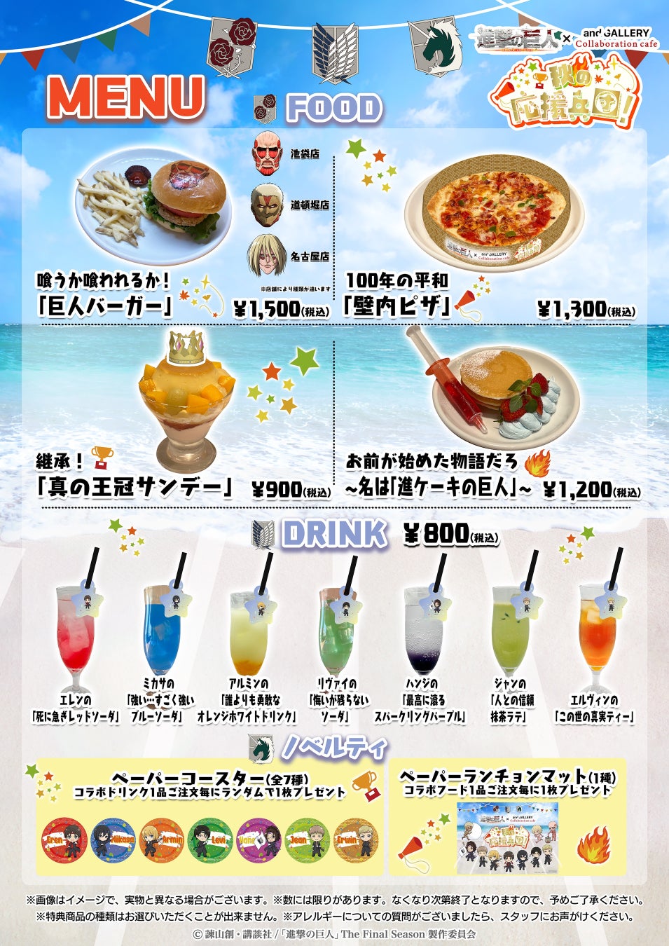 TV ANIMATION 『Attack On Titan』s Collaboration Cafes Menus & Goods information are now released!Stores will be opened for a limited of time from 2nd of September at 「and GALLERY」in three different locations IKEBUKURO・DOTONBORI・NAGOYA
